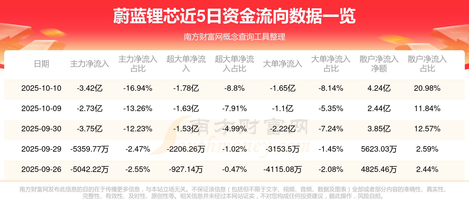 10月10日消息,蔚藍(lán)鋰芯10月10日主力凈流出3.42億元,超大單凈流出1.78億元,大單凈流出1.65億元,散戶(hù)凈流入4.24億元。