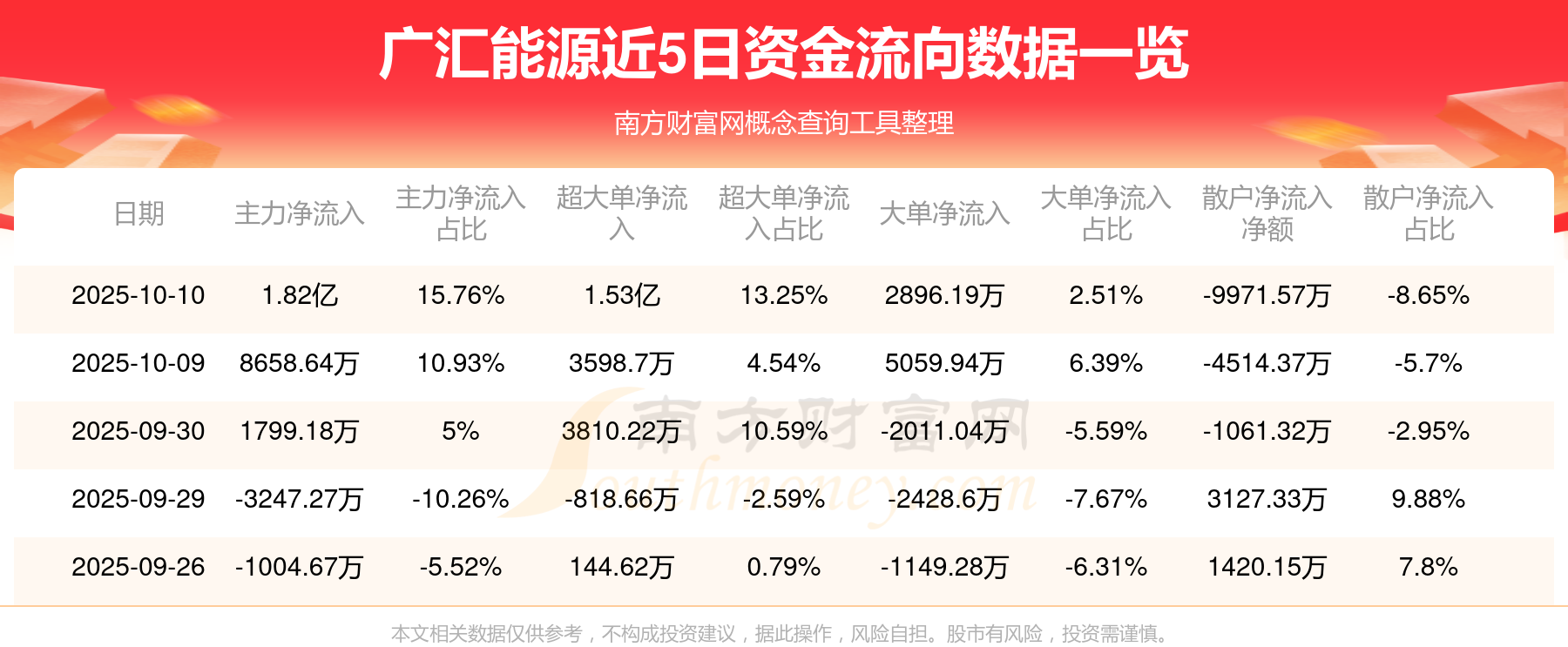 10月10日消息,廣匯能源10月10日主力凈流入1.82億元,超大單凈流入1.53億元,大單凈流入2896.19萬(wàn)元,散戶(hù)凈流出9971.57萬(wàn)元。
