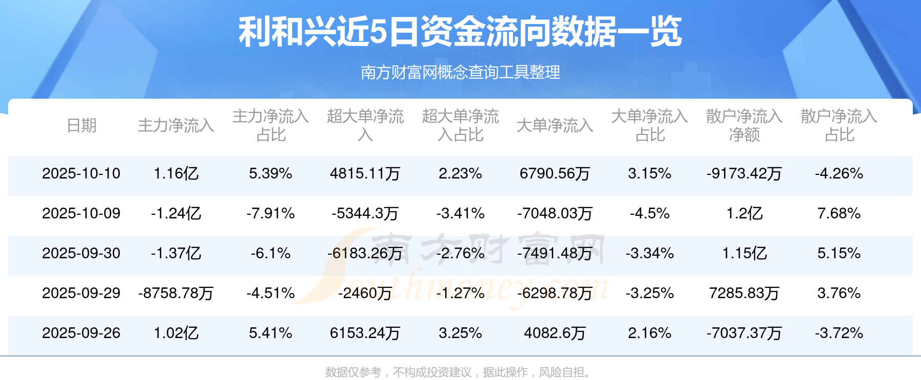 10月10日消息,利和興主力資金凈流入1.16億元,超大單資金凈流入4815.11萬元,散戶資金凈流出9173.42萬元。
