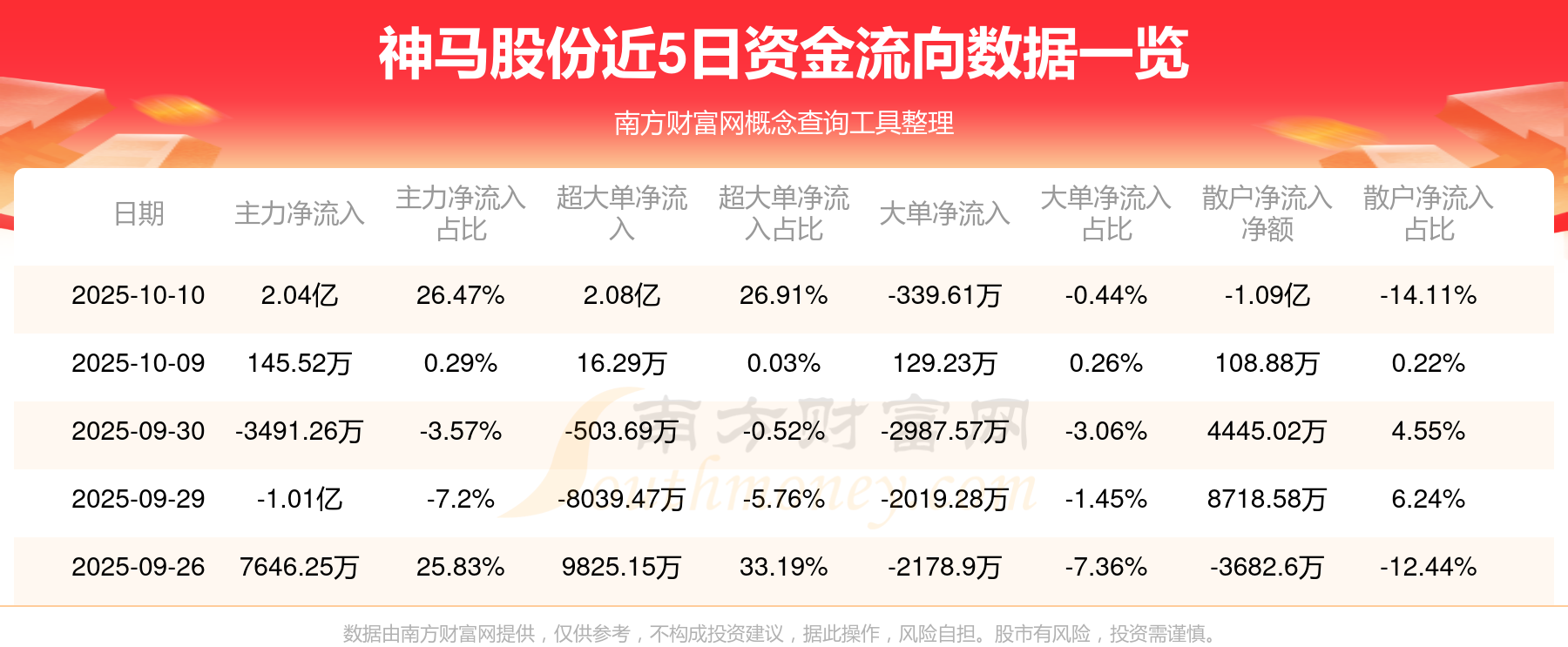 資金流向數(shù)據(jù)方面,10月10日主力資金凈流流入2.04億元,超大單資金凈流入2.08億元,大單資金凈流出339.61萬(wàn)元,散戶資金凈流出1.09億元。