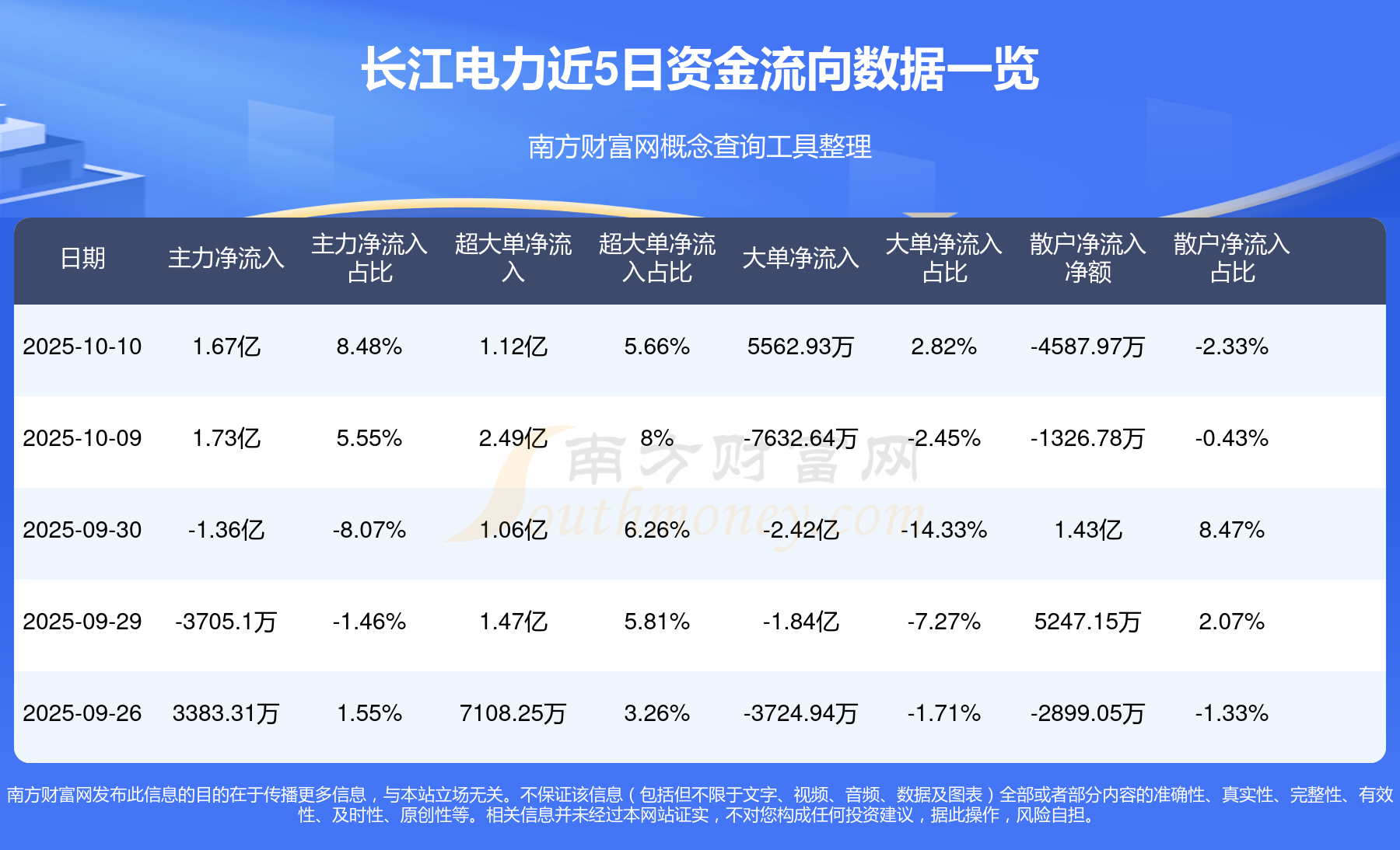 10月10日消息,長(zhǎng)江電力資金凈流入1.67億元,超大單資金凈流入1.12億元,換手率0.3%,成交金額19.73億元。