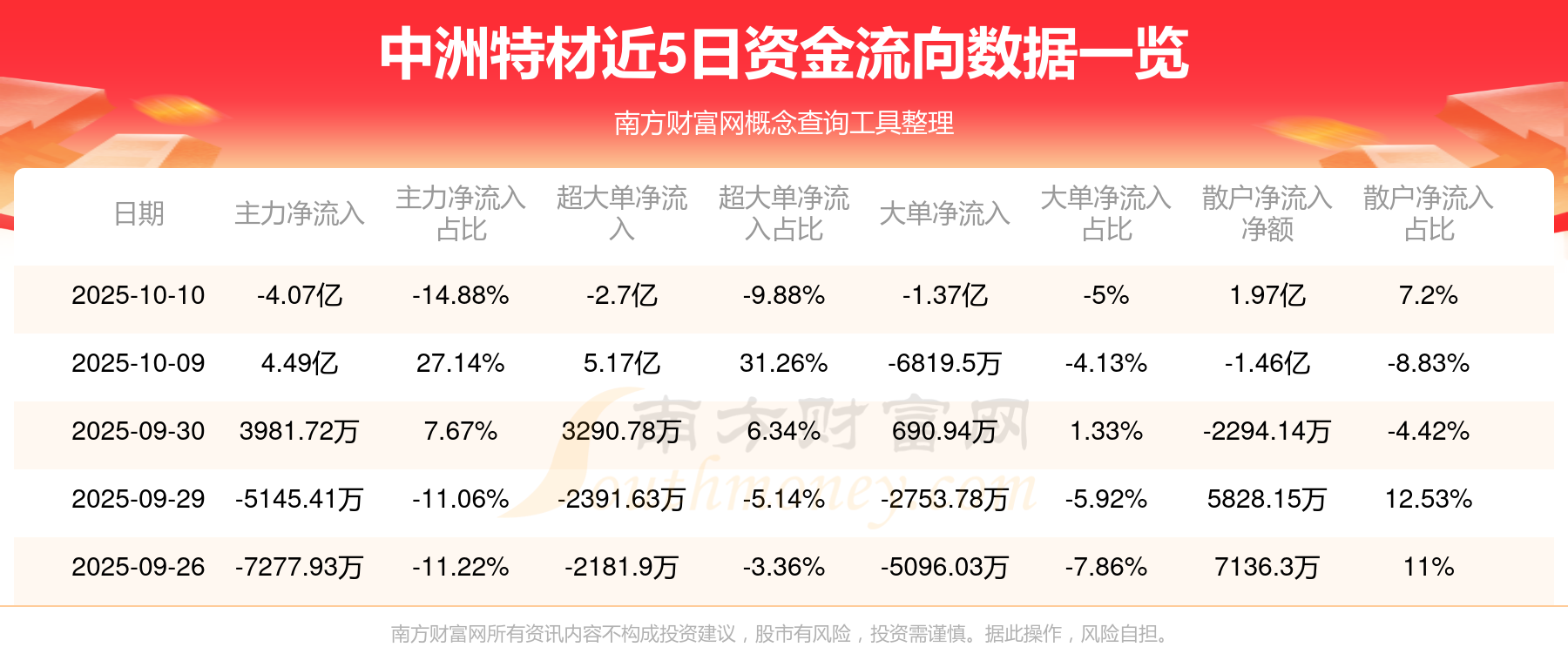 10月10日消息,中洲特材10月10日主力凈流出4.07億元,超大單凈流出2.7億元,大單凈流出1.37億元,散戶凈流入1.97億元。