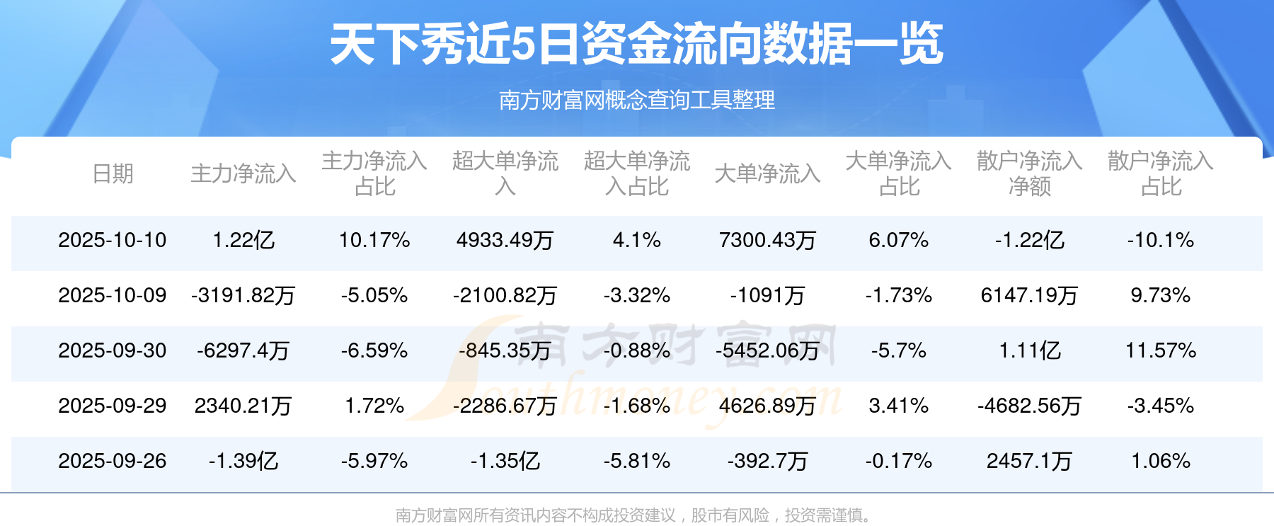 10月10日消息,天下秀資金凈流入1.22億元,超大單凈流入4933.49萬元,換手率11.55%,成交金額11.85億元。