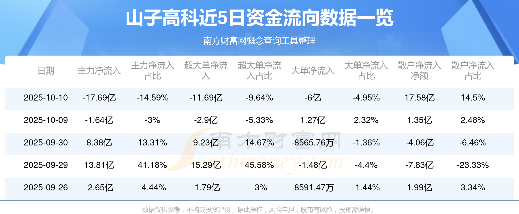 10月10日消息,山子高科資金凈流出17.69億元,超大單資金凈流出11.69億元,換手率27.24%,成交金額121.24億元。