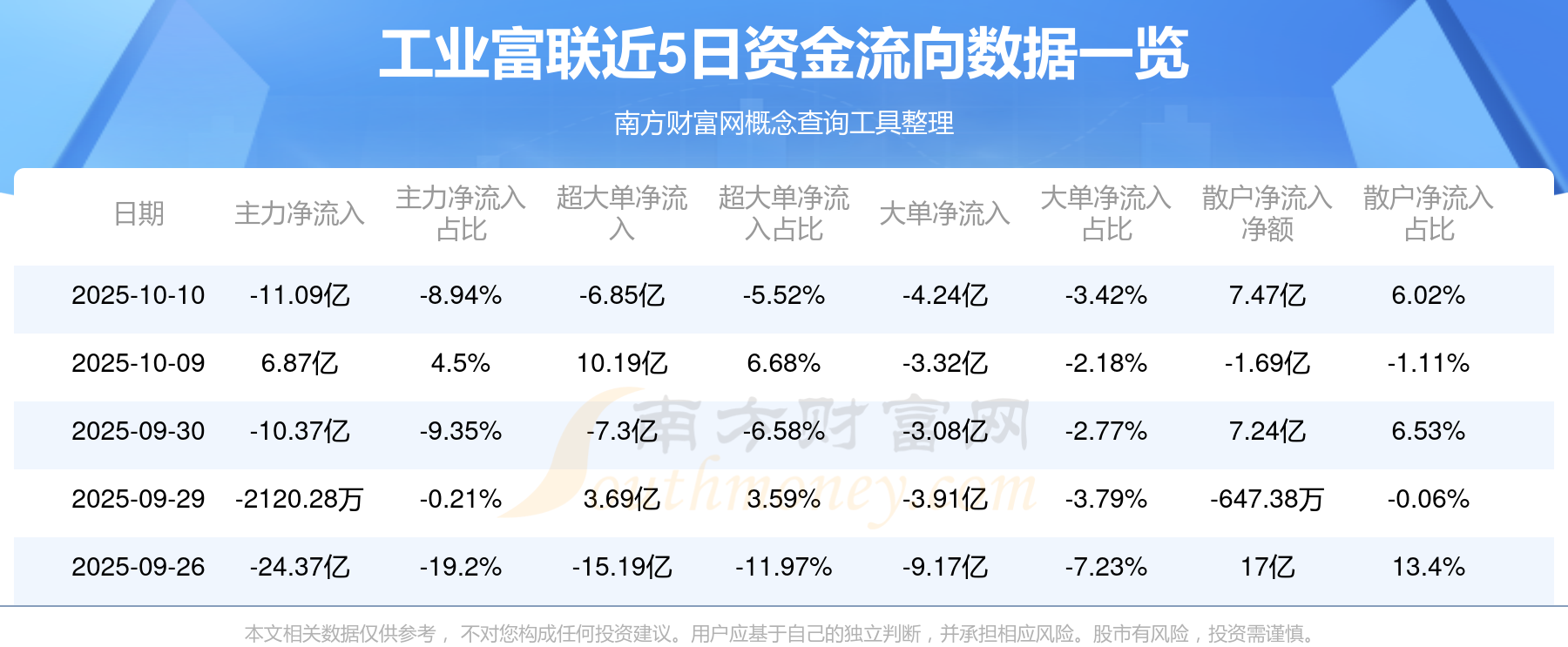 10月10日該股主力資金凈流出11.09億元,超大單資金凈流出6.85億元,大單資金凈流出4.24億元,中單資金凈流入3.62億元,散戶資金凈流入7.47億元。