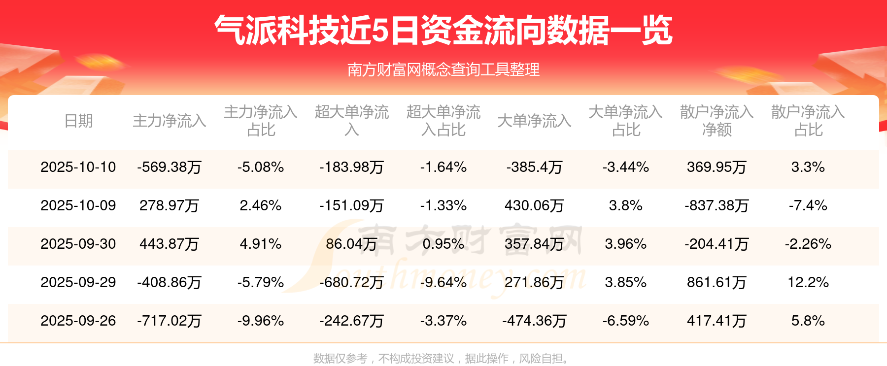 10月10日消息,氣派科技資金凈流出569.38萬元,超大單資金凈流出183.98萬元,換手率4.12%,成交金額1.12億元。