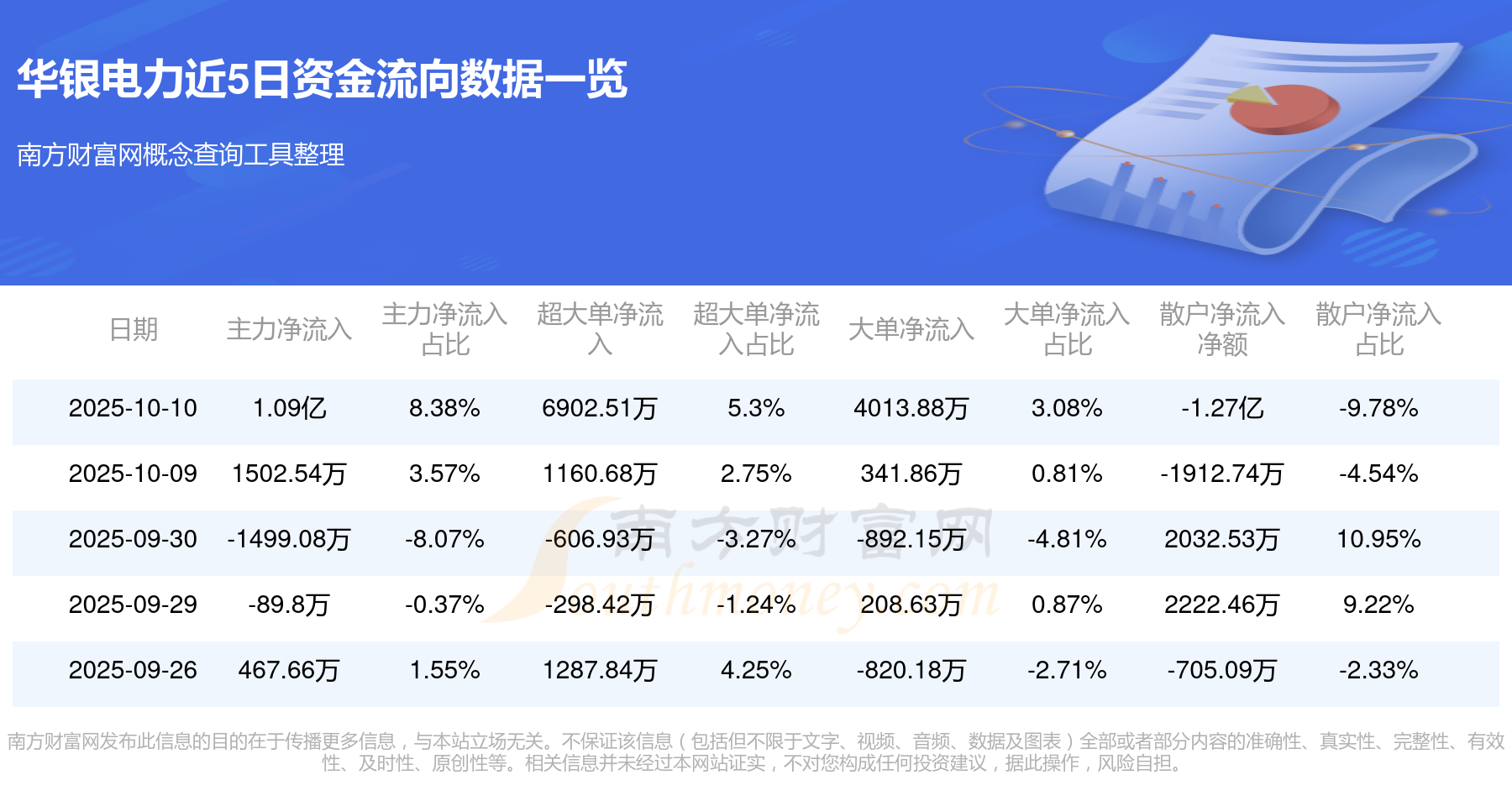 10月10日消息,華銀電力資金凈流入1.09億元,超大單凈流入6902.51萬元,換手率9.61%,成交金額13.03億元。