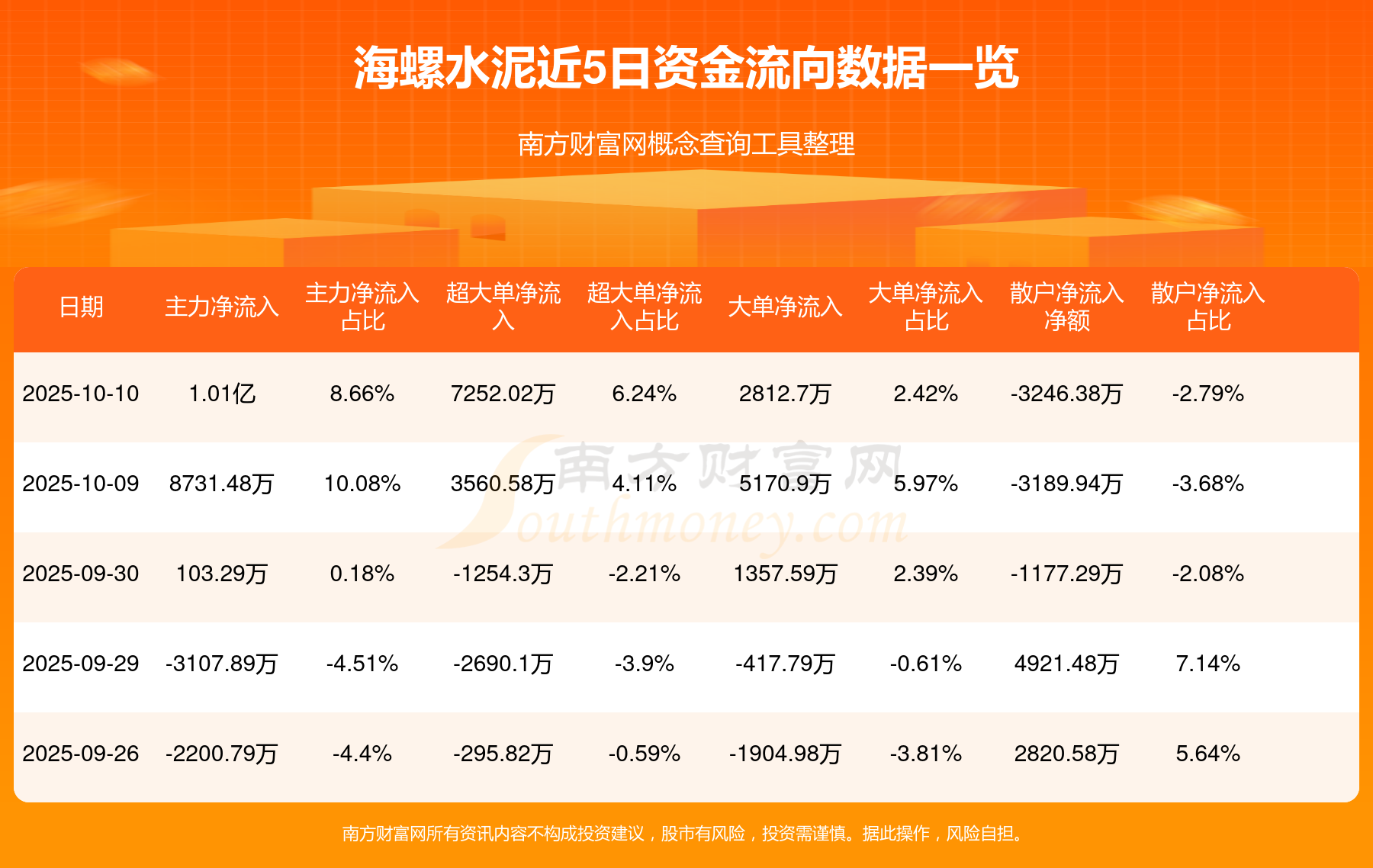 10月10日消息,海螺水泥資金凈流入1.01億元,超大單資金凈流入7252.02萬元,換手率1.2%,成交金額11.53億元。