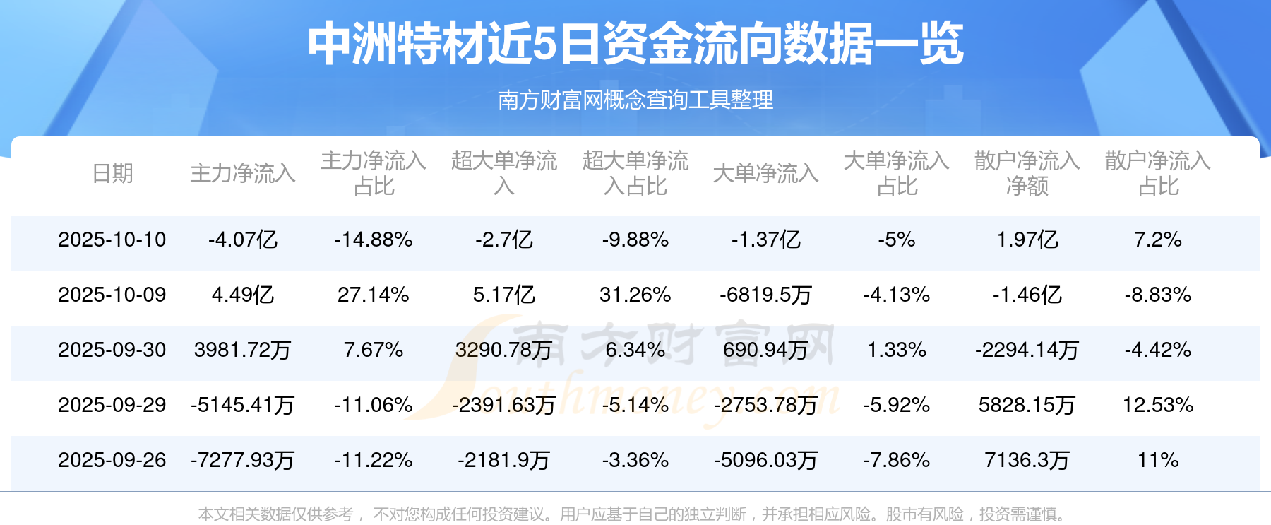 10月10日消息,中洲特材10月10日主力凈流出4.07億元,超大單凈流出2.7億元,大單凈流出1.37億元,散戶凈流入1.97億元。