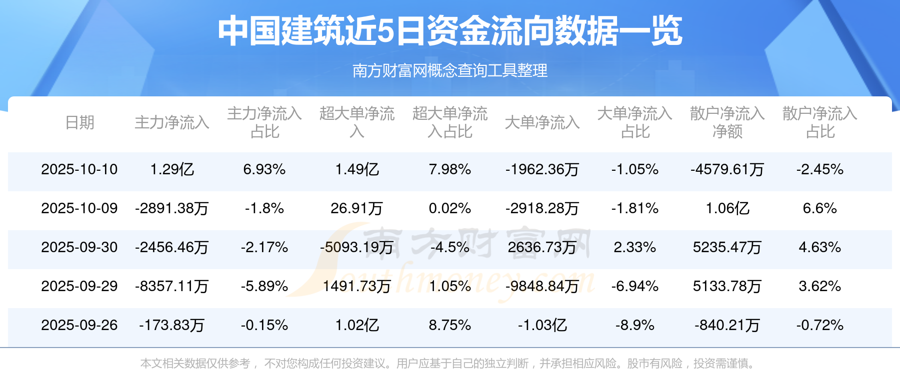 10月10日消息,中國建筑10月10日主力資金凈流入1.29億元,超大單資金凈流入1.49億元,大單資金凈流出1962.36萬元,散戶資金凈流出4579.61萬元。