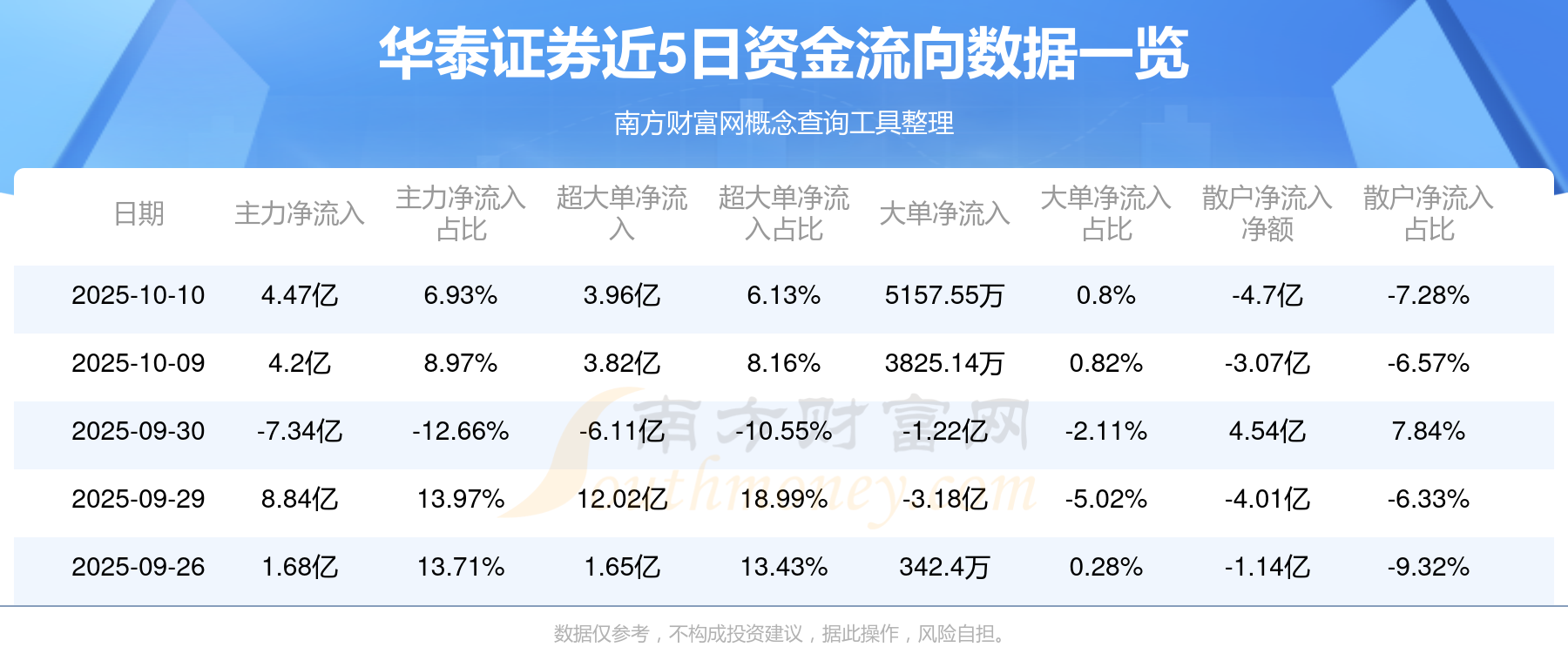 10月10日消息,華泰證券資金凈流入4.47億元,超大單凈流入3.96億元,換手率3.82%,成交金額64.51億元。