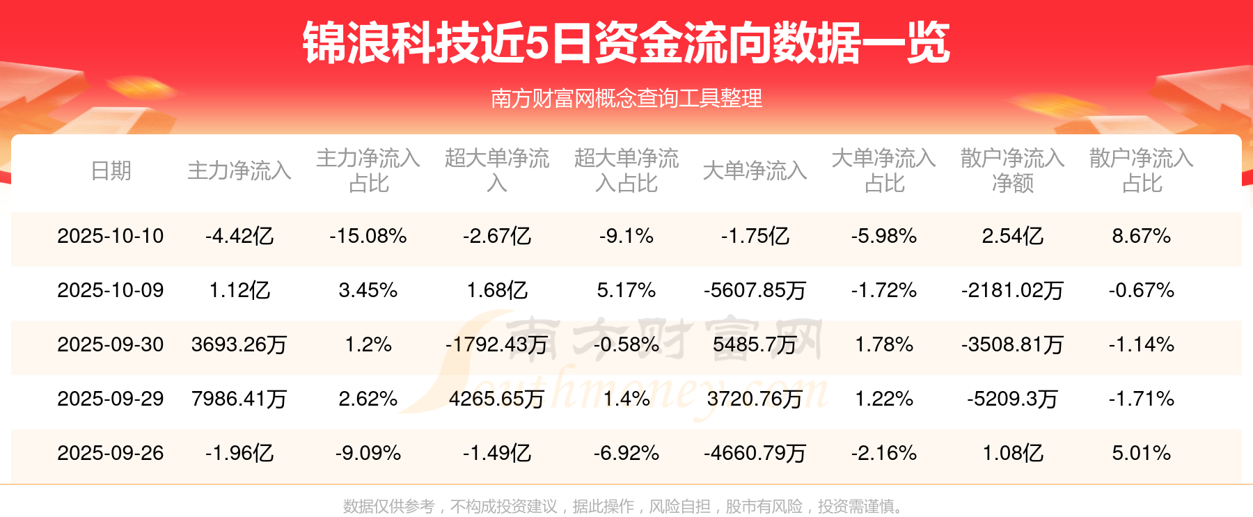 10月10日消息,錦浪科技主力凈流出4.42億元,超大單凈流出2.67億元,散戶凈流入2.54億元。