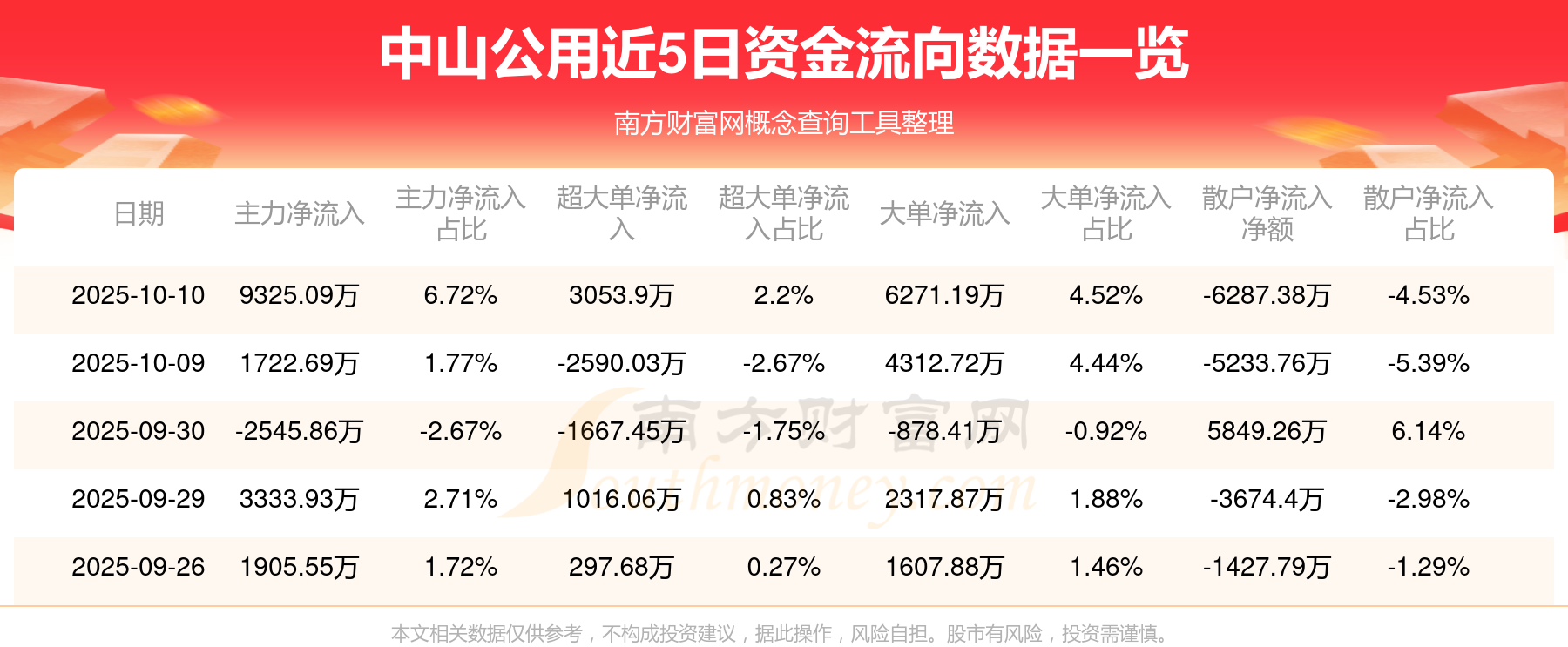 10月10日消息,中山公用10月10日主力凈流入9325.09萬元,超大單凈流入3053.9萬元,大單凈流入6271.19萬元,散戶凈流出6287.38萬元。