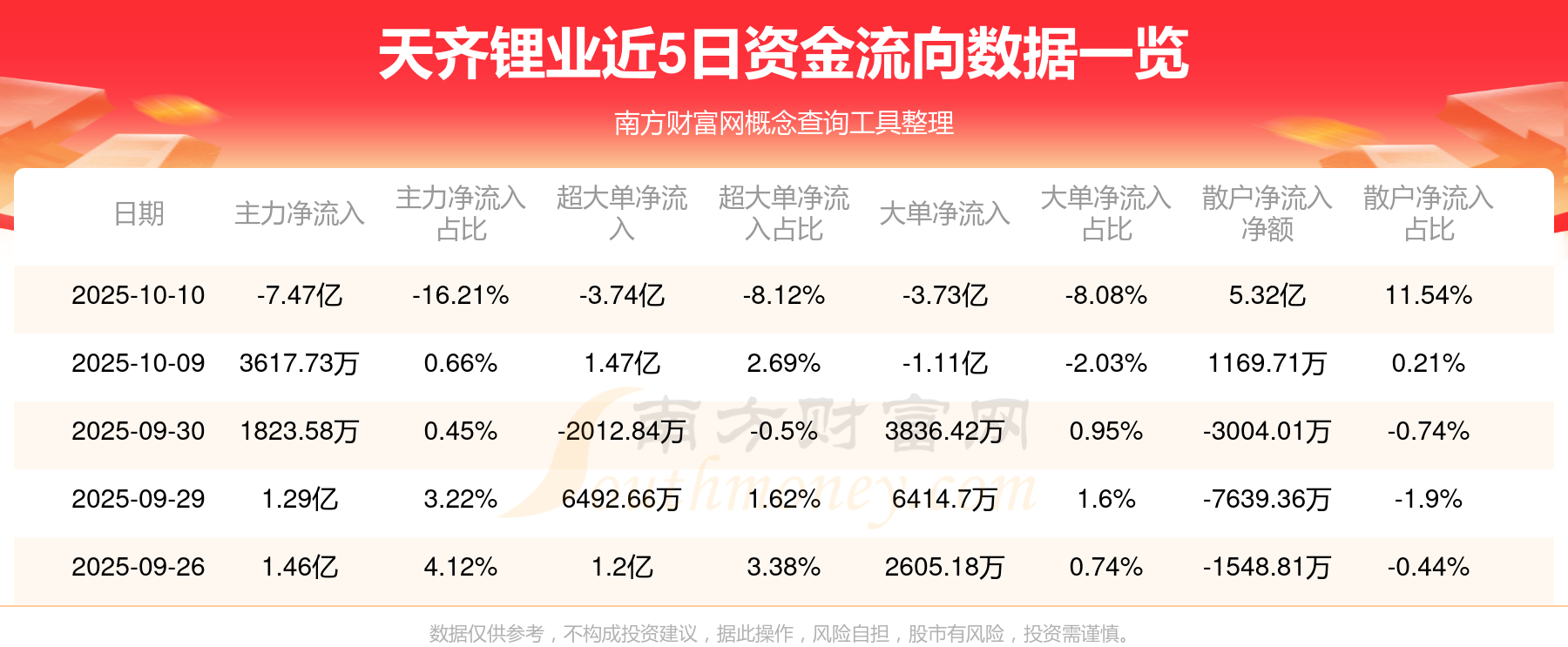 10月10日消息,天齊鋰業(yè)10月10日主力資金凈流出7.47億元,超大單資金凈流出3.74億元,大單資金凈流出3.73億元,散戶資金凈流入5.32億元。