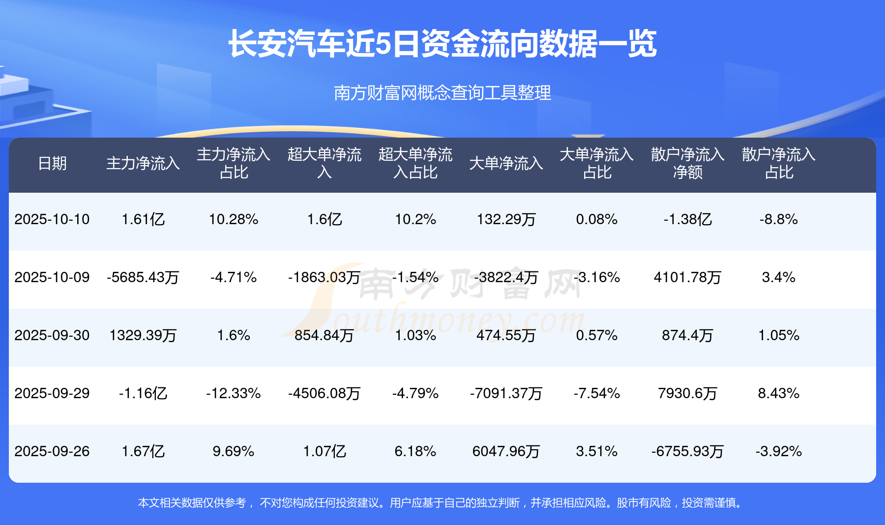 10月10日消息,長(zhǎng)安汽車主力凈流入1.61億元,超大單凈流入1.6億元,散戶凈流出1.38億元。