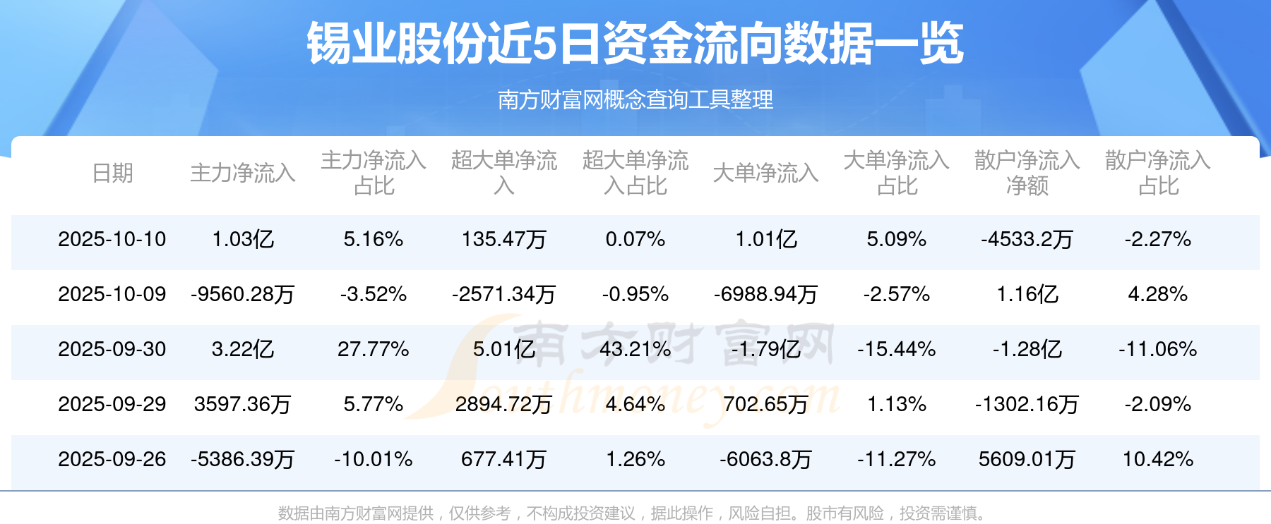 10月10日消息,錫業(yè)股份10月10日主力資金凈流入1.03億元,超大單資金凈流入135.47萬元,大單資金凈流入1.01億元,散戶資金凈流出4533.2萬元。