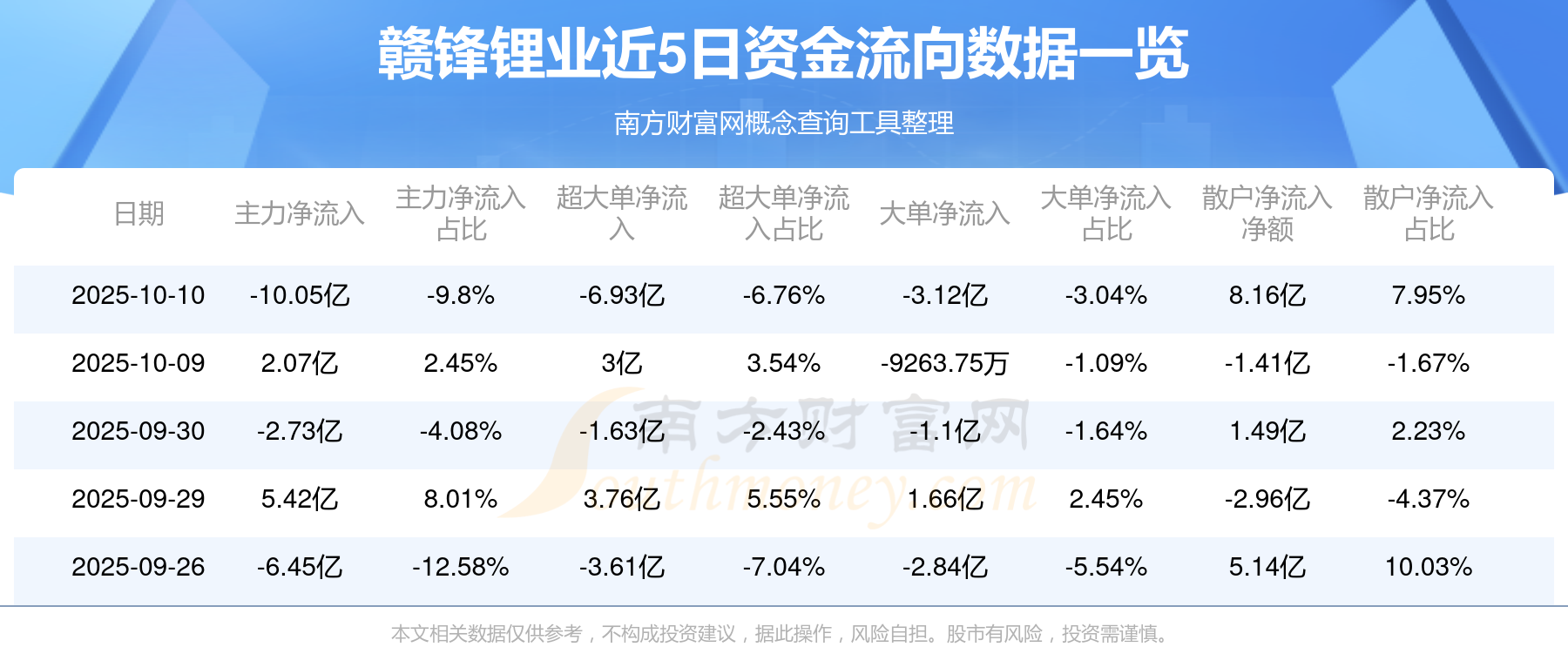 10月10日消息,贛鋒鋰業(yè)主力凈流出10.05億元,超大單凈流出6.93億元,散戶凈流入8.16億元。