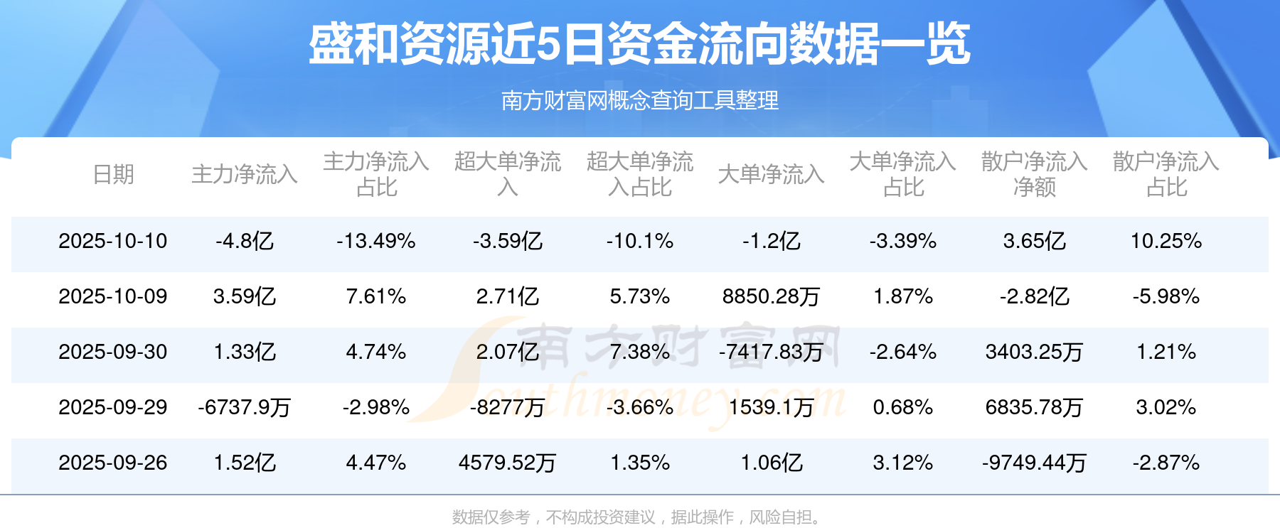 10月10日消息,盛和資源主力資金凈流出4.8億元,超大單資金凈流出3.59億元,散戶資金凈流入3.65億元。