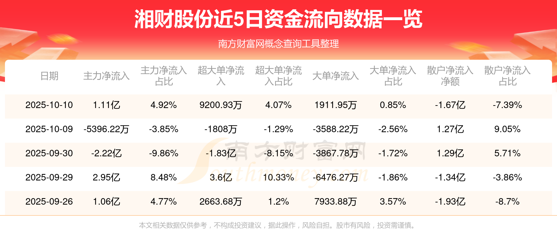 10月10日消息,湘財股份資金凈流入1.11億元,超大單資金凈流入9200.93萬元,換手率5.79%,成交金額22.32億元。