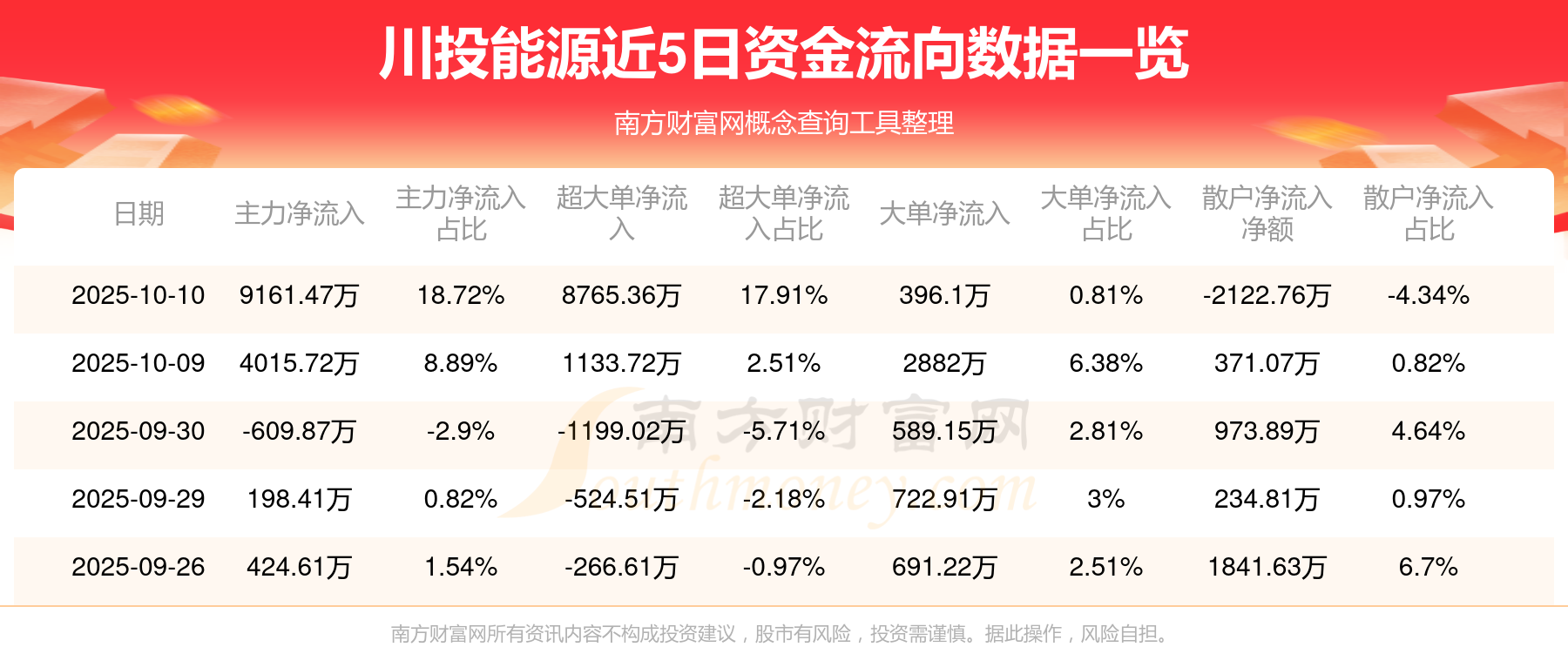 10月10日消息,川投能源10月10日主力凈流入9161.47萬元,超大單凈流入8765.36萬元,大單凈流入396.1萬元,散戶凈流出2122.76萬元。