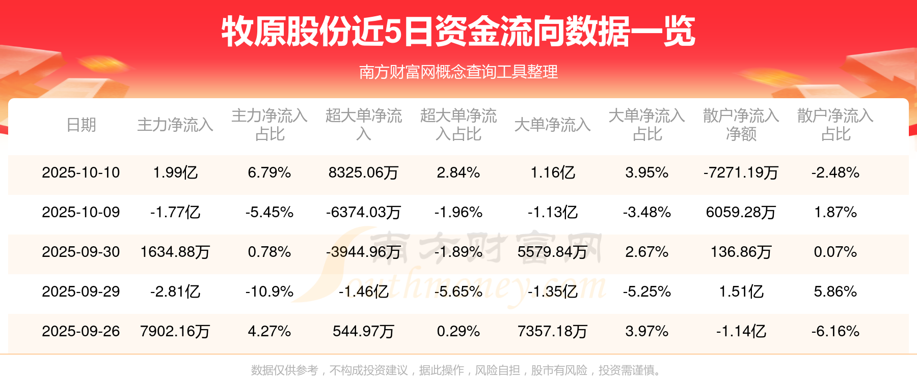 10月10日該股主力凈流入1.99億元,超大單凈流入8325.06萬元,大單凈流入1.16億元,中單凈流出1.26億元,散戶凈流出7271.19萬元。