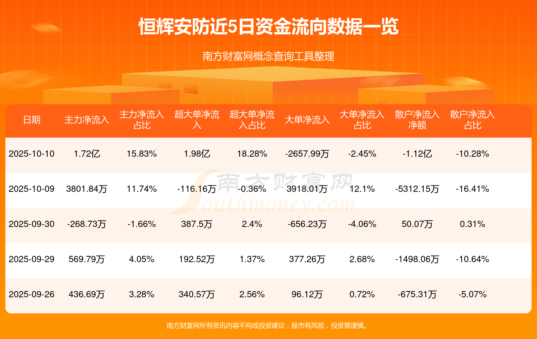 10月10日消息,恒輝安防主力凈流入1.72億元,超大單凈流入1.98億元,散戶凈流出1.12億元。