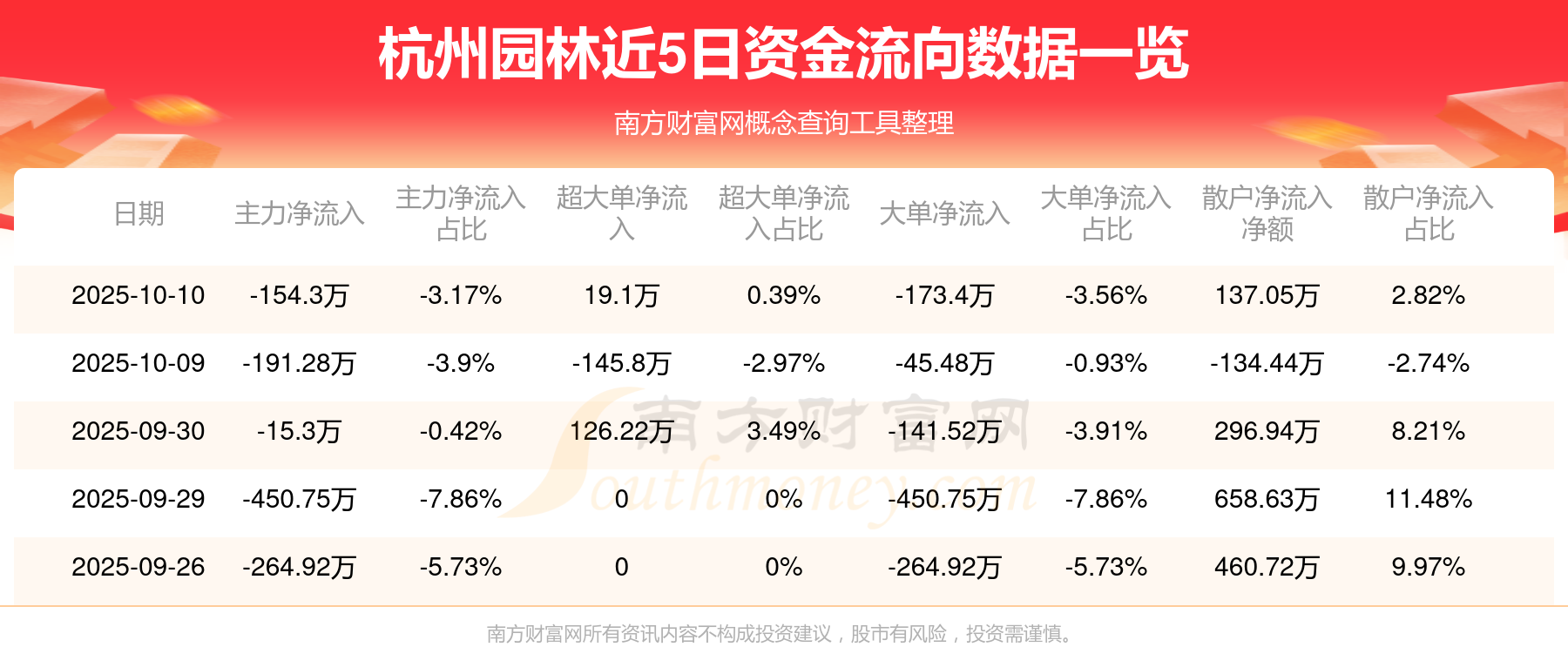 10月10日消息,杭州園林主力資金凈流出154.3萬元,超大單資金凈流入19.1萬元,散戶資金凈流入137.05萬元。
