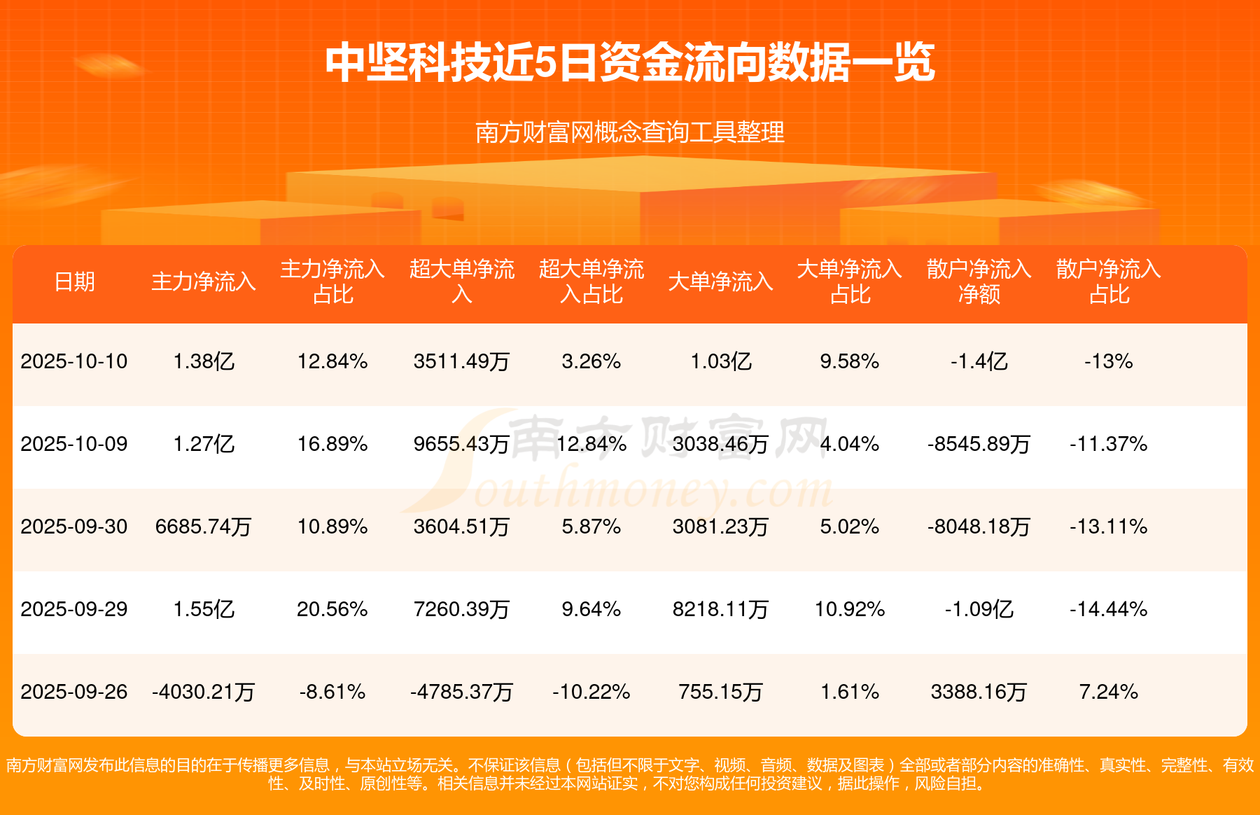 10月10日消息,中堅科技10月10日主力凈流入1.38億元,超大單凈流入3511.49萬元,大單凈流入1.03億元,散戶凈流出1.4億元。