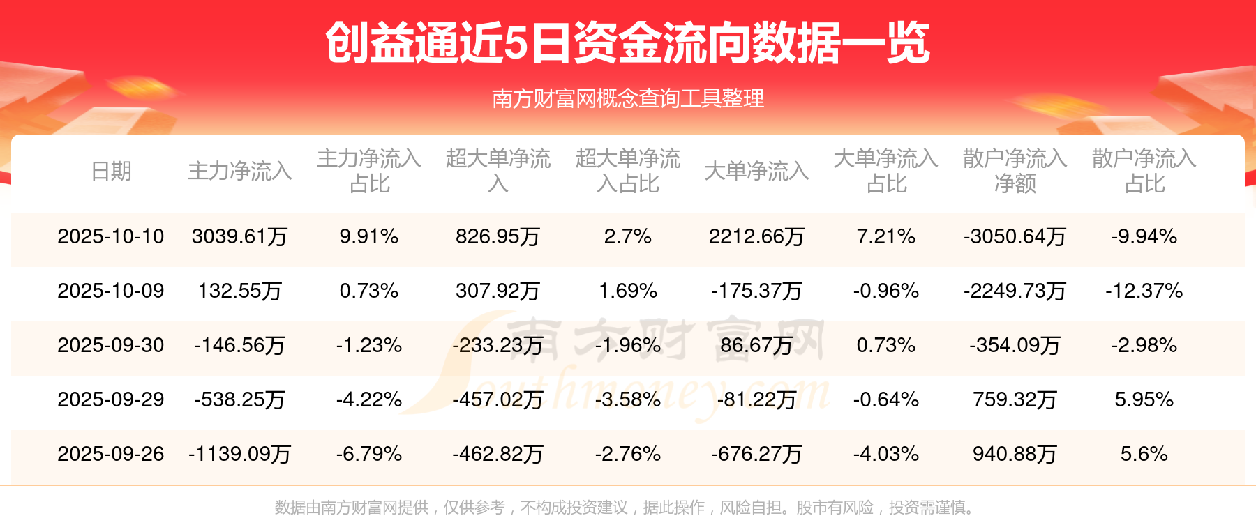 10月10日消息,創(chuàng)益通10月10日主力資金凈流入3039.61萬元,超大單資金凈流入826.95萬元,大單資金凈流入2212.66萬元,散戶資金凈流出3050.64萬元。