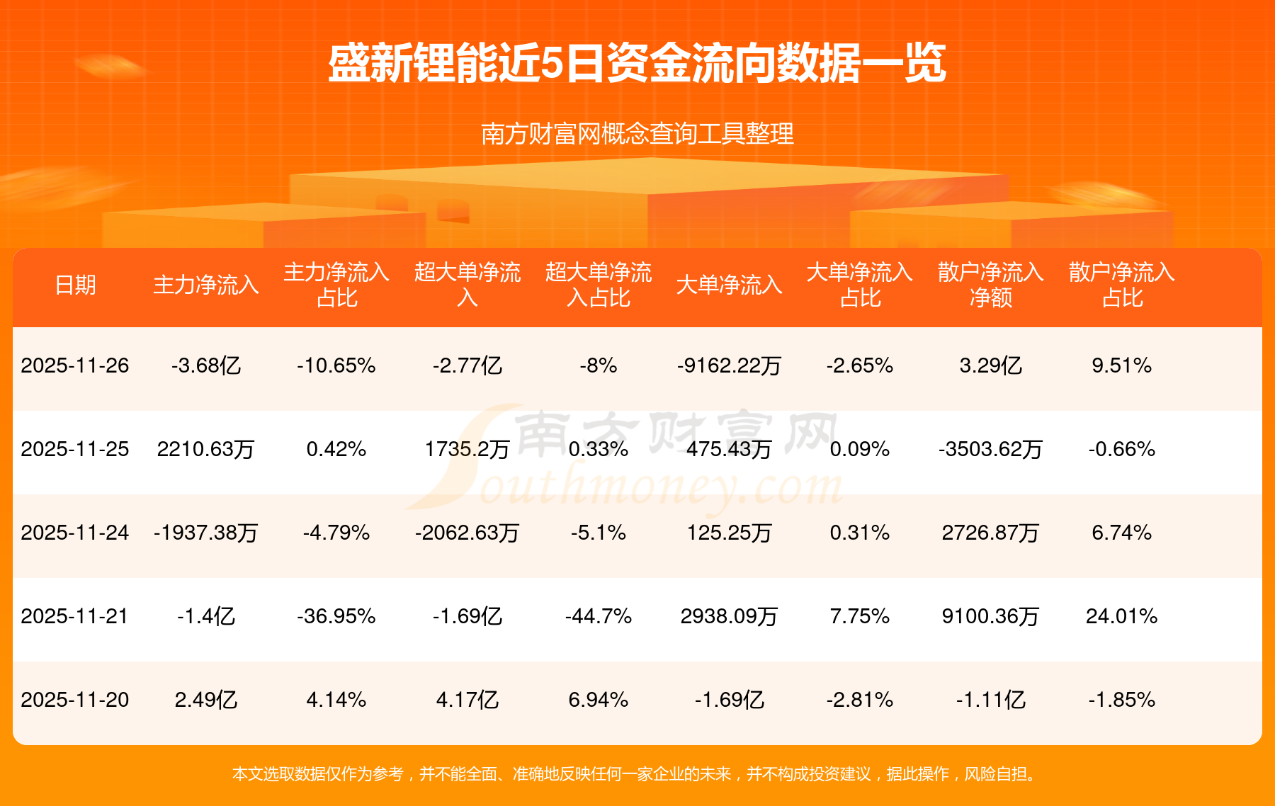 11月26日消息,盛新鋰能資金凈流出3.68億元,超大單資金凈流出2.77億元,換手率6.34%,成交金額18.17億元。