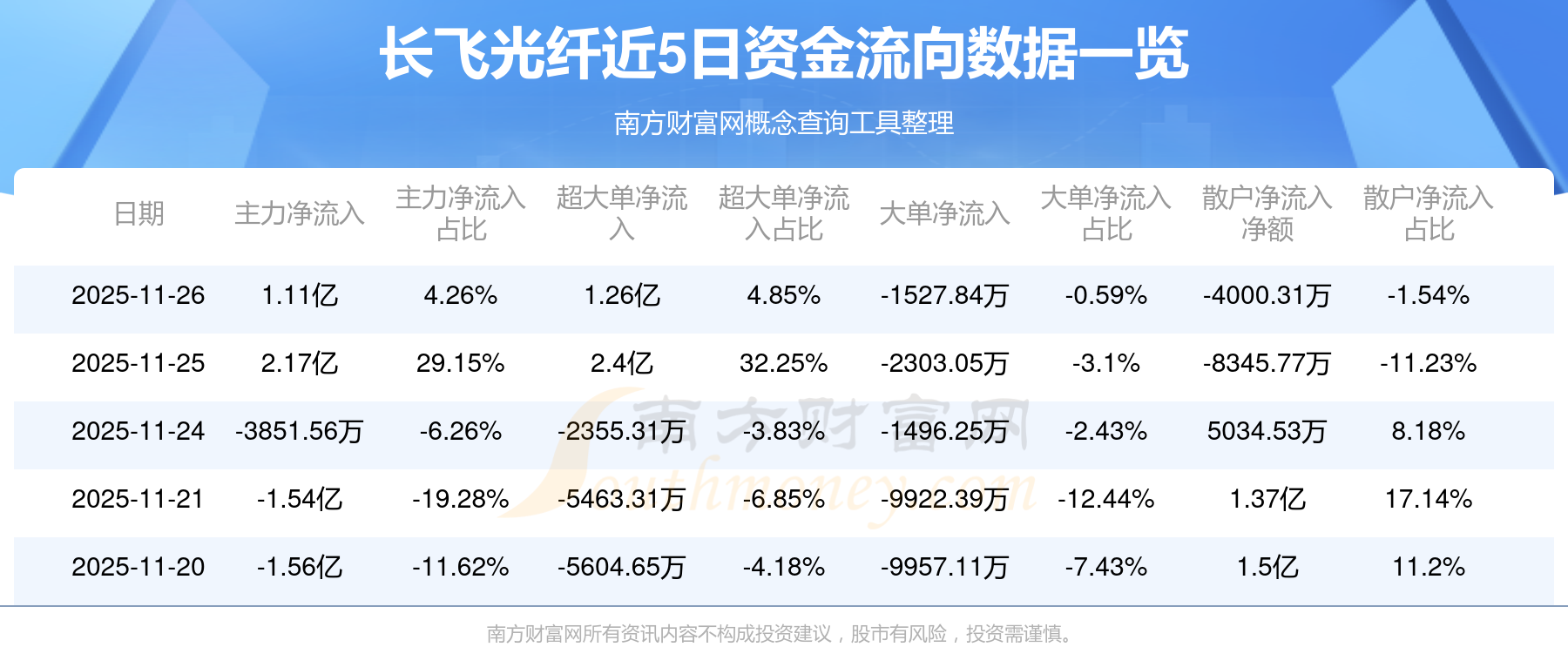 11月26日消息,長(zhǎng)飛光纖11月26日主力凈流入1.11億元,超大單凈流入1.26億元,大單凈流出1527.84萬(wàn)元,散戶(hù)凈流出4000.31萬(wàn)元。