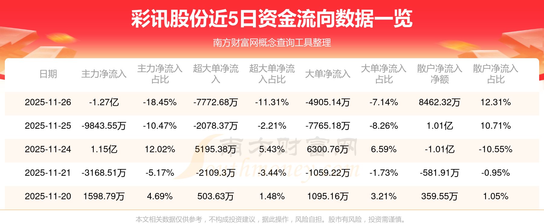 11月26日消息,彩訊股份資金凈流出1.27億元,超大單資金凈流出7772.68萬(wàn)元,換手率2.85%,成交金額3.36億元。