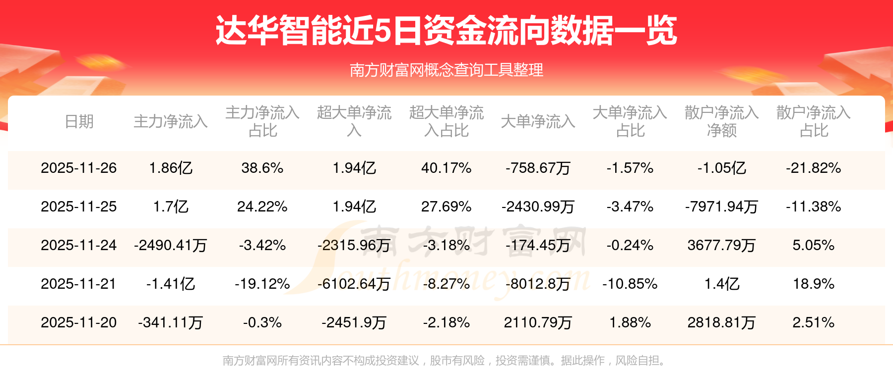 11月26日消息,達(dá)華智能11月26日主力凈流入1.86億元,超大單凈流入1.94億元,大單凈流出758.67萬(wàn)元,散戶凈流出1.05億元。