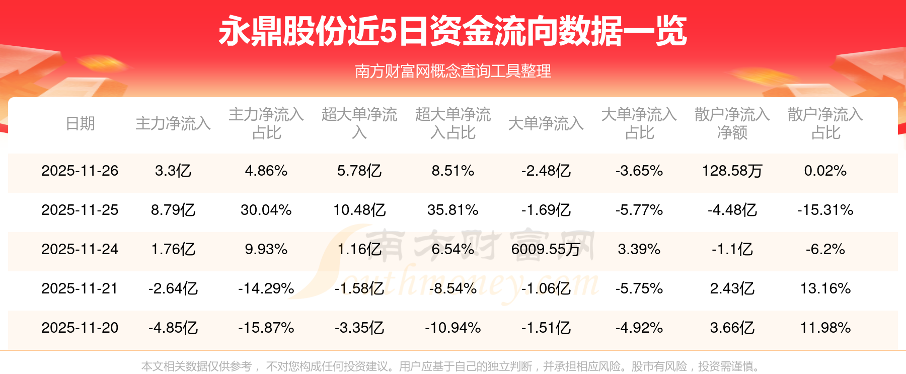 11月26日消息,永鼎股份11月26日主力凈流入3.3億元,超大單凈流入5.78億元,大單凈流出2.48億元,散戶凈流入128.58萬元。