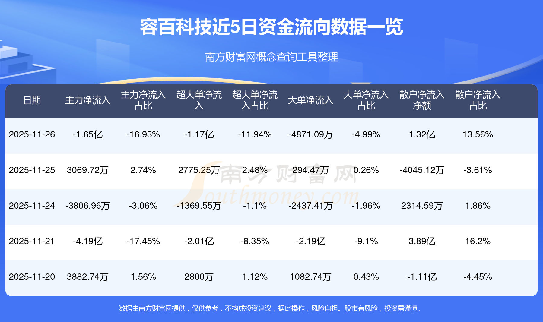 11月26日消息,容百科技主力凈流出1.65億元,超大單凈流出1.17億元,散戶凈流入1.32億元。