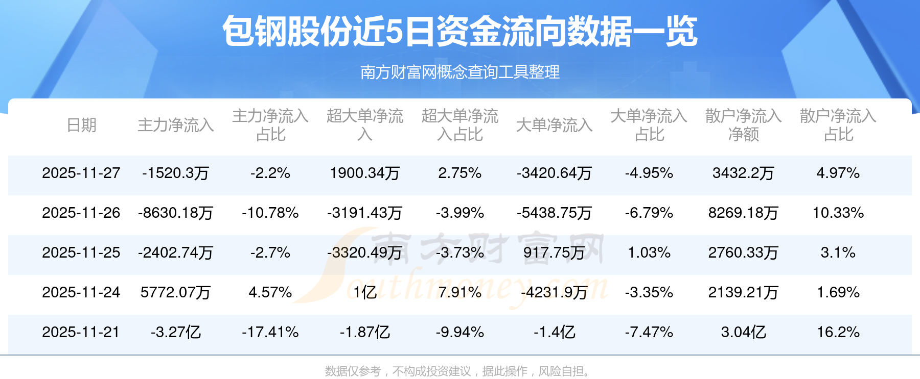 11月27日消息,包鋼股份11月27日主力資金凈流出1520.3萬(wàn)元,超大單資金凈流入1900.34萬(wàn)元,大單資金凈流出3420.64萬(wàn)元,散戶(hù)資金凈流入3432.2萬(wàn)元。