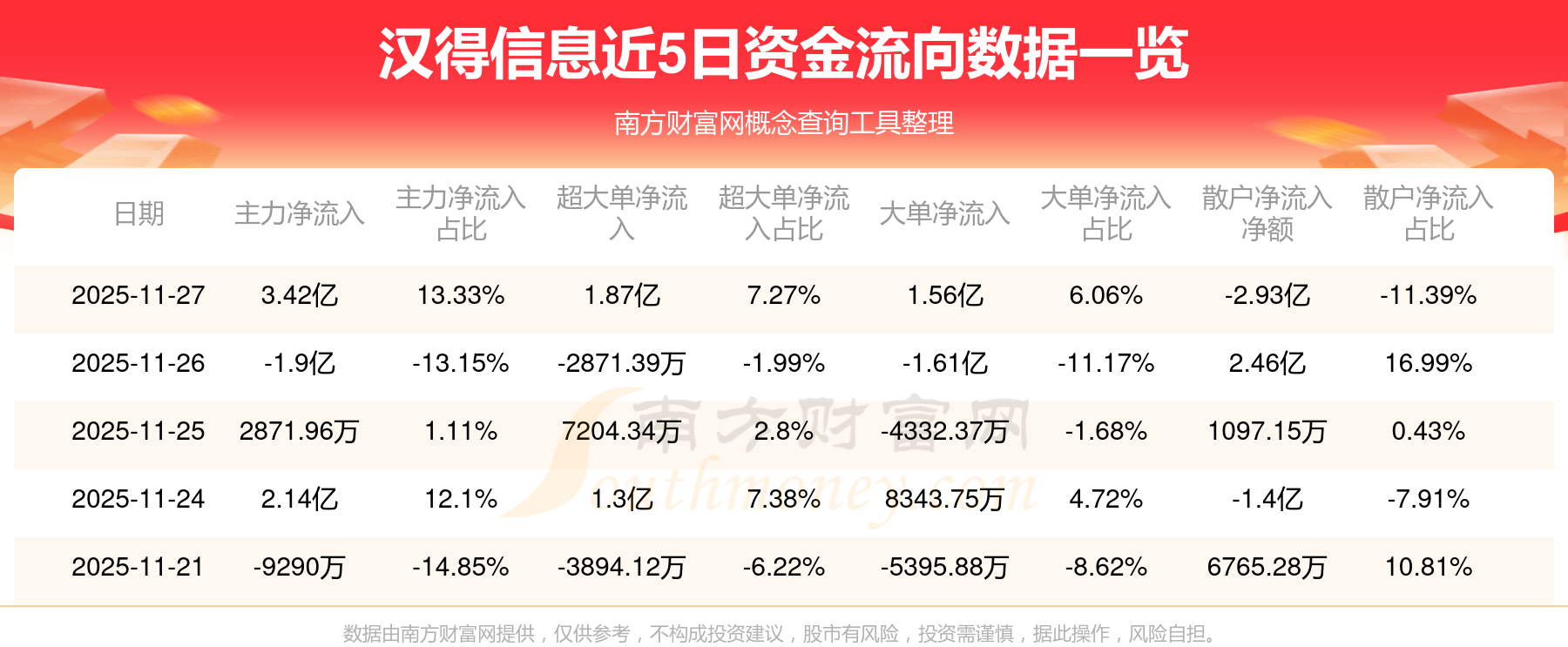11月27日消息,漢得信息11月27日主力資金凈流入3.42億元,超大單資金凈流入1.87億元,大單資金凈流入1.56億元,散戶資金凈流出2.93億元。