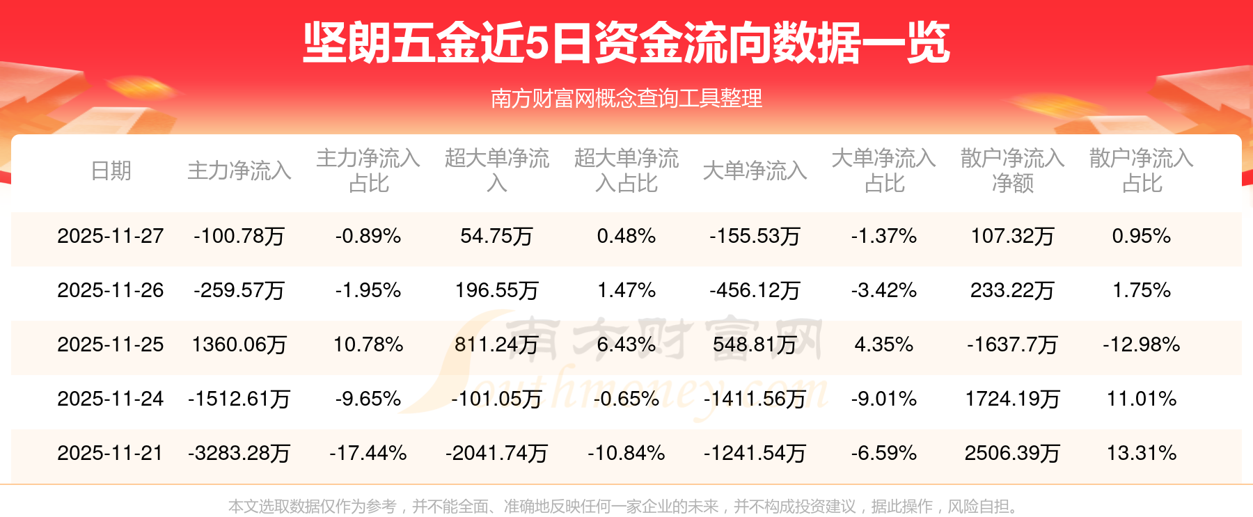 11月27日消息,堅朗五金主力資金凈流出100.78萬元,超大單資金凈流入54.75萬元,散戶資金凈流入107.32萬元。
