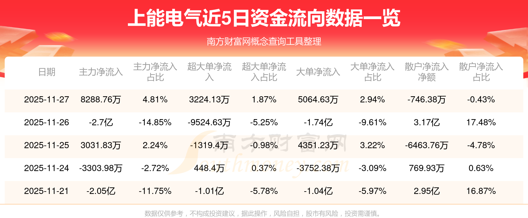 11月27日消息,上能電氣11月27日主力凈流入8288.76萬元,超大單凈流入3224.13萬元,大單凈流入5064.63萬元,散戶凈流出746.38萬元。