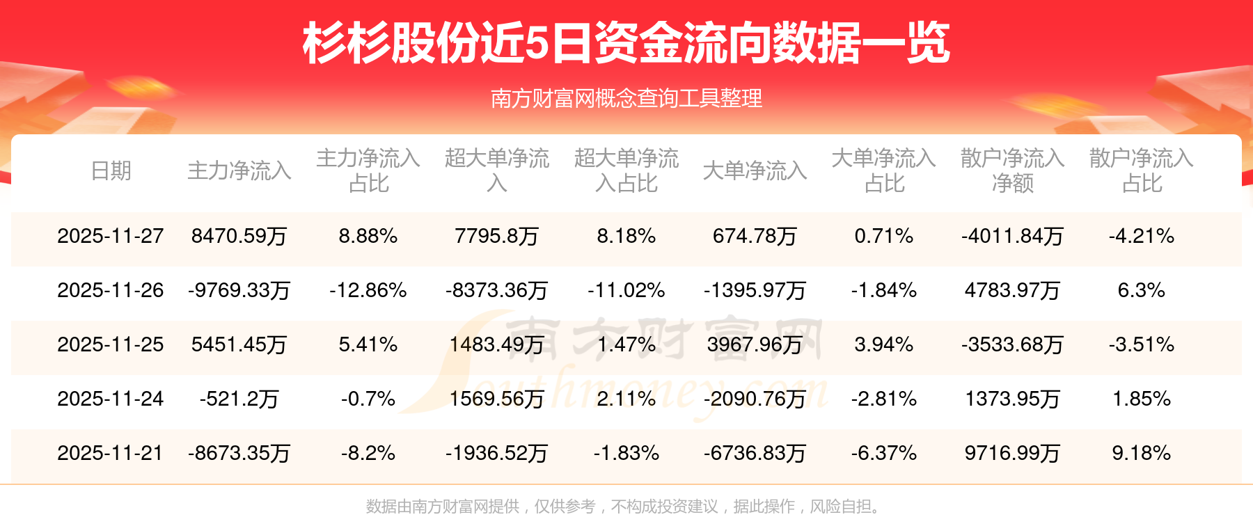 11月27日消息,杉杉股份主力凈流入8470.59萬元,超大單凈流入7795.8萬元,散戶凈流出4011.84萬元。