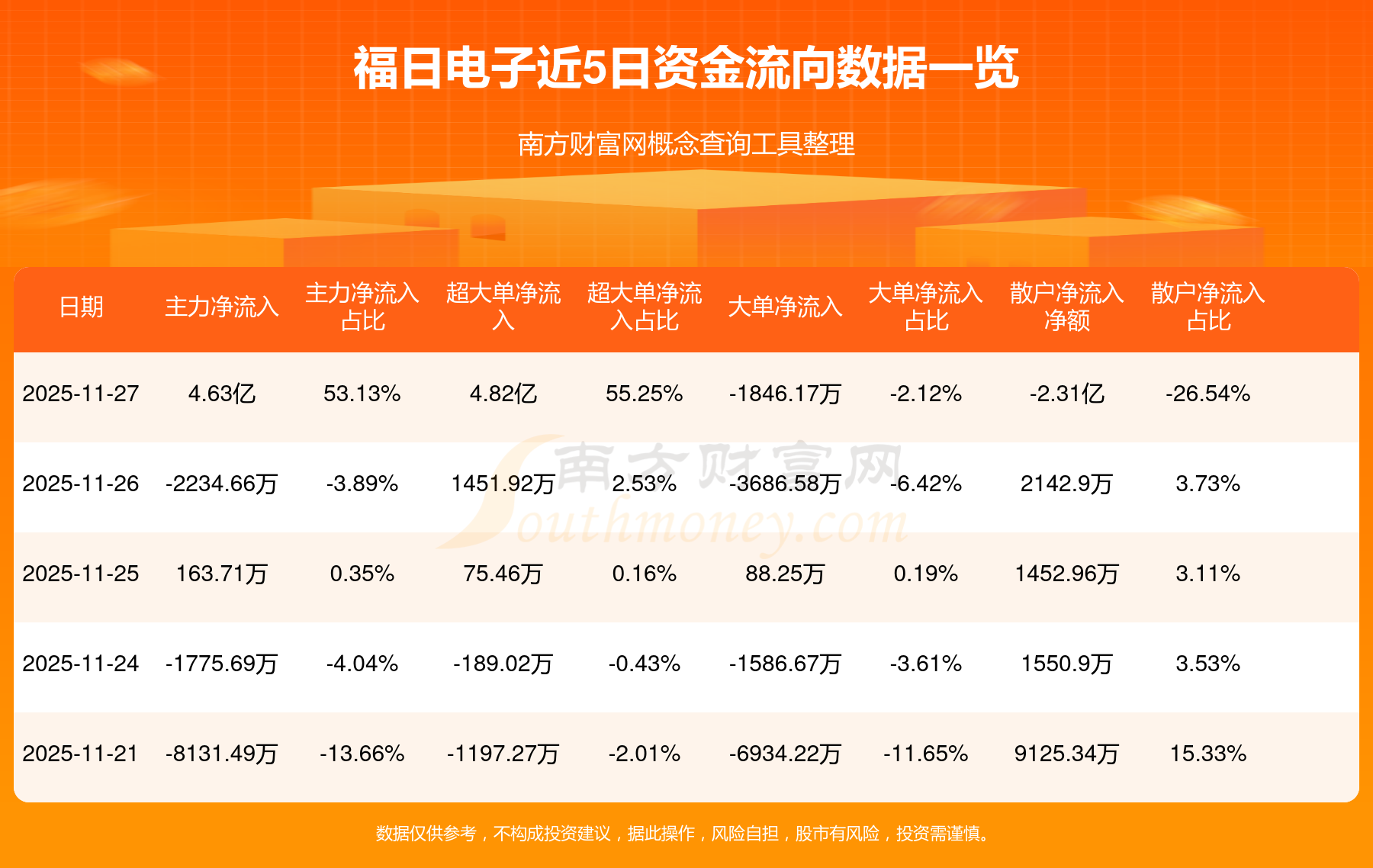 11月27日消息,福日電子11月27日主力資金凈流入4.63億元,超大單資金凈流入4.82億元,大單資金凈流出1846.17萬元,散戶資金凈流出2.31億元。