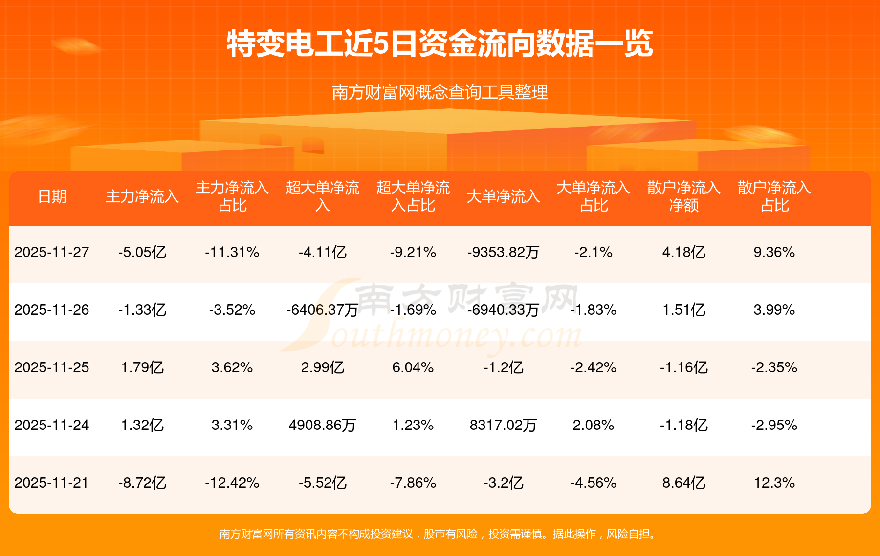 11月27日該股主力凈流出5.05億元,超大單凈流出4.11億元,大單凈流出9353.82萬元,中單凈流入8691.99萬元,散戶凈流入4.18億元。