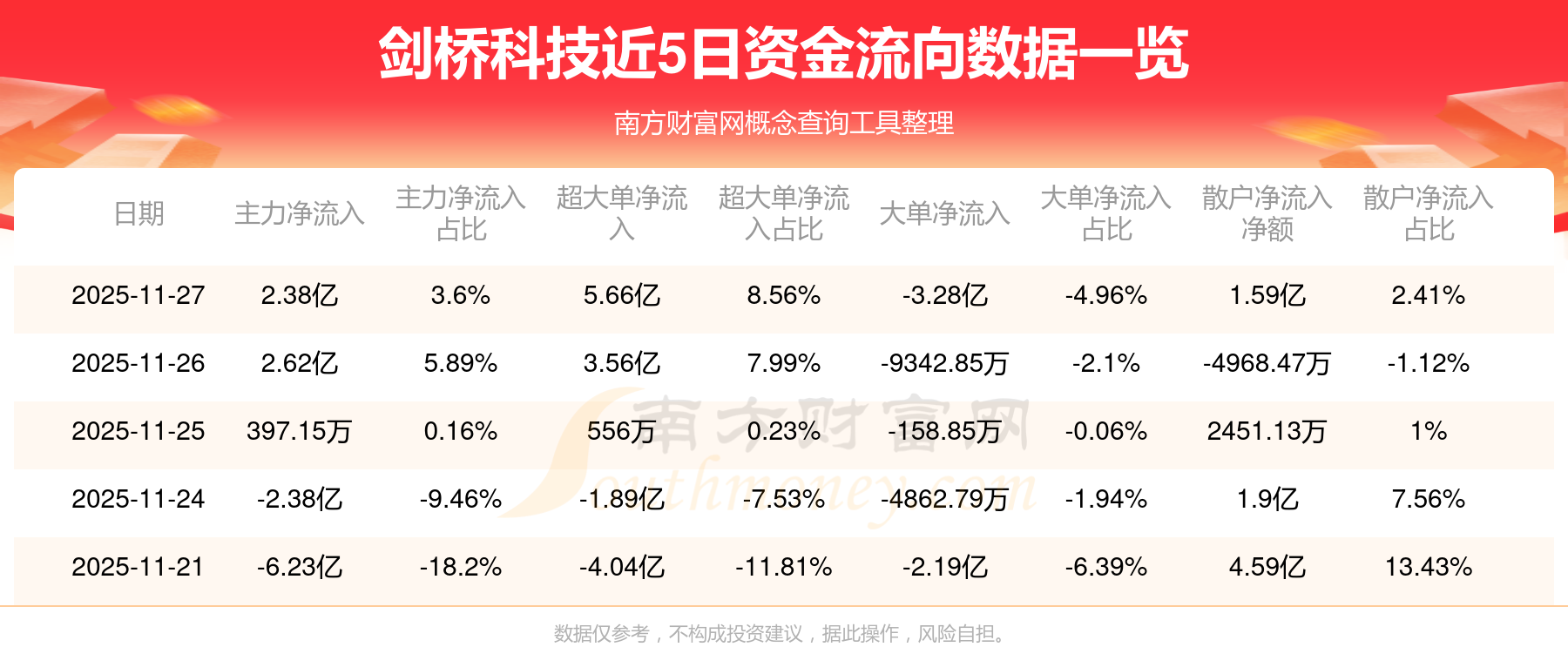 11月27日消息,劍橋科技11月27日主力資金凈流入2.38億元,超大單資金凈流入5.66億元,大單資金凈流出3.28億元,散戶(hù)資金凈流入1.59億元。