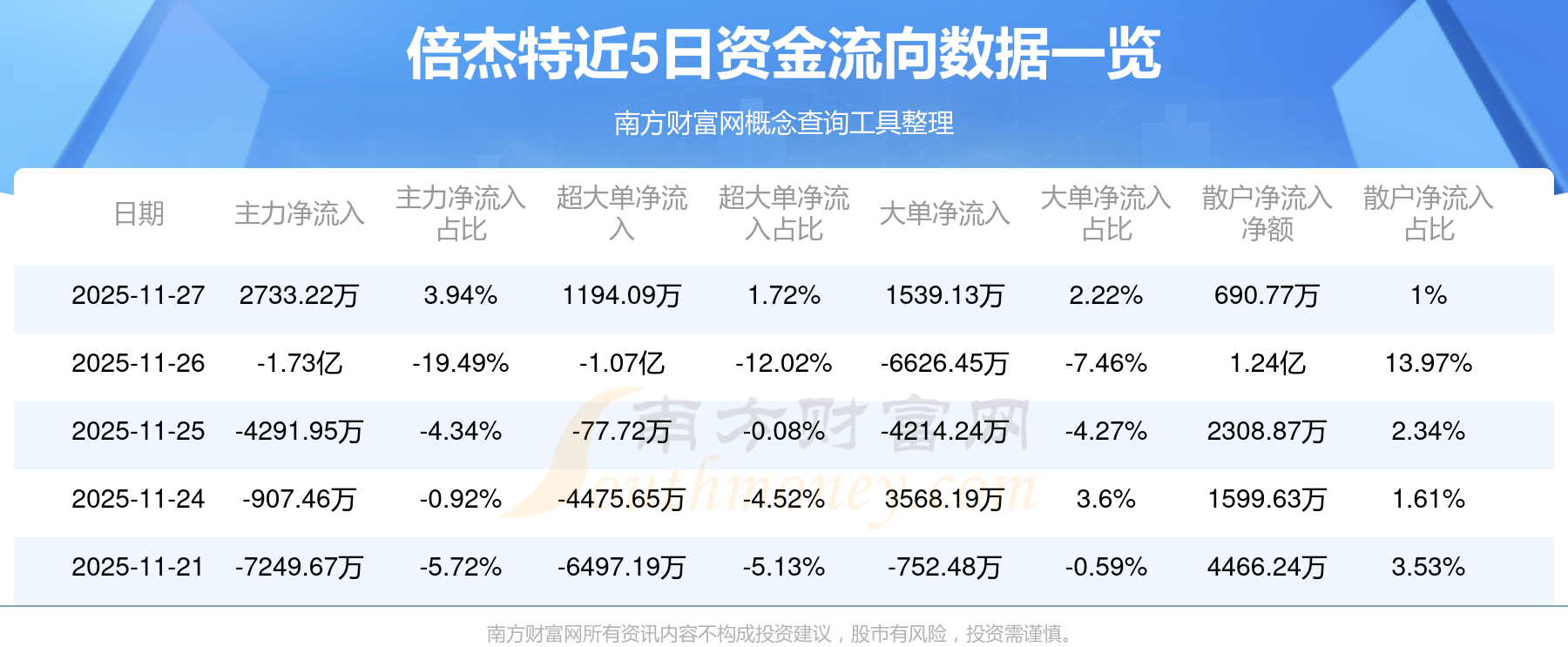 11月27日消息,倍杰特11月27日主力凈流入2733.22萬元,超大單凈流入1194.09萬元,大單凈流入1539.13萬元,散戶凈流入690.77萬元。