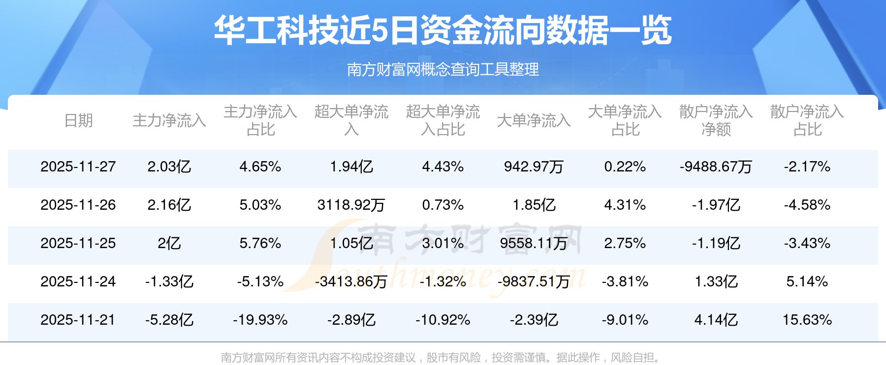 11月27日消息,華工科技主力凈流入2.03億元,超大單凈流入1.94億元,散戶凈流出9488.67萬元。