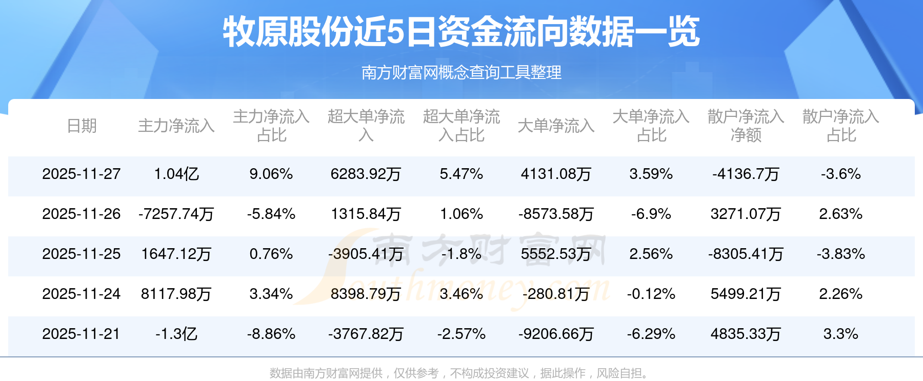 11月27日消息,牧原股份主力凈流入1.04億元,超大單凈流入6283.92萬(wàn)元,散戶凈流出4136.7萬(wàn)元。