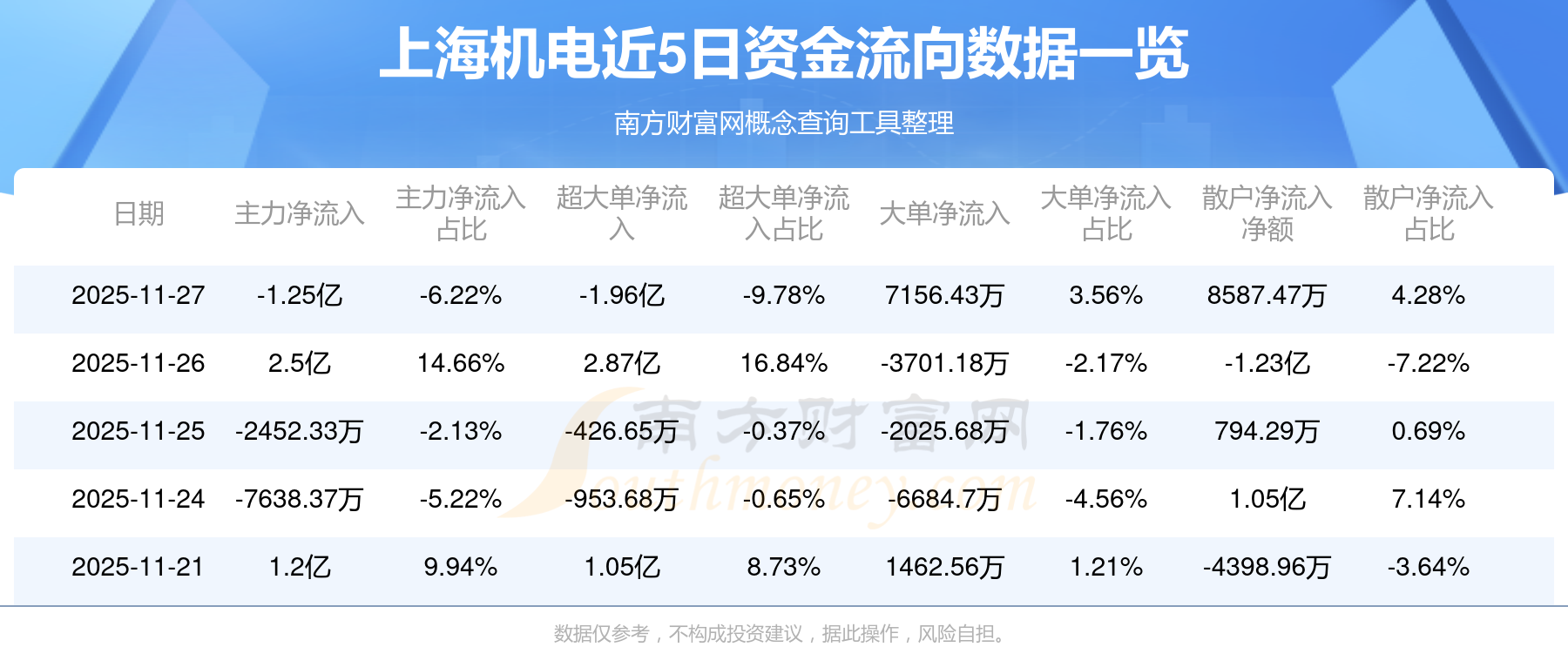 11月27日消息,上海機電11月27日主力資金凈流出1.25億元,超大單資金凈流出1.96億元,大單資金凈流入7156.43萬元,散戶資金凈流入8587.47萬元。