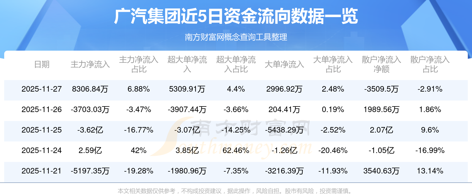 11月27日消息,廣汽集團(tuán)主力資金凈流入8306.84萬(wàn)元,超大單資金凈流入5309.91萬(wàn)元,散戶資金凈流出3509.5萬(wàn)元。