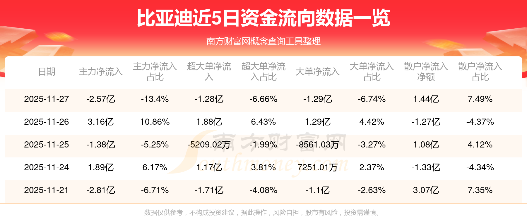 11月27日消息,比亞迪主力凈流出2.57億元,超大單凈流出1.28億元,散戶凈流入1.44億元。