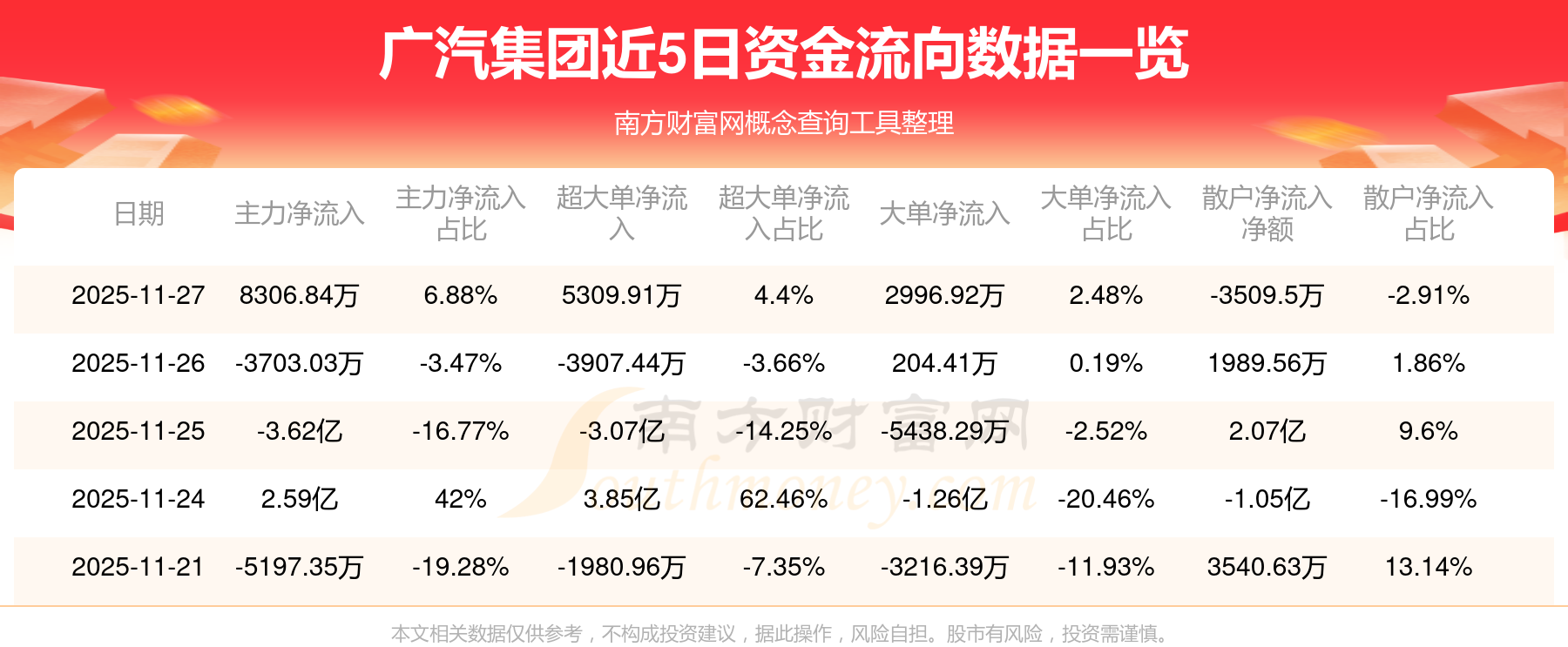 11月27日消息,廣汽集團主力資金凈流入8306.84萬元,超大單資金凈流入5309.91萬元,散戶資金凈流出3509.5萬元。
